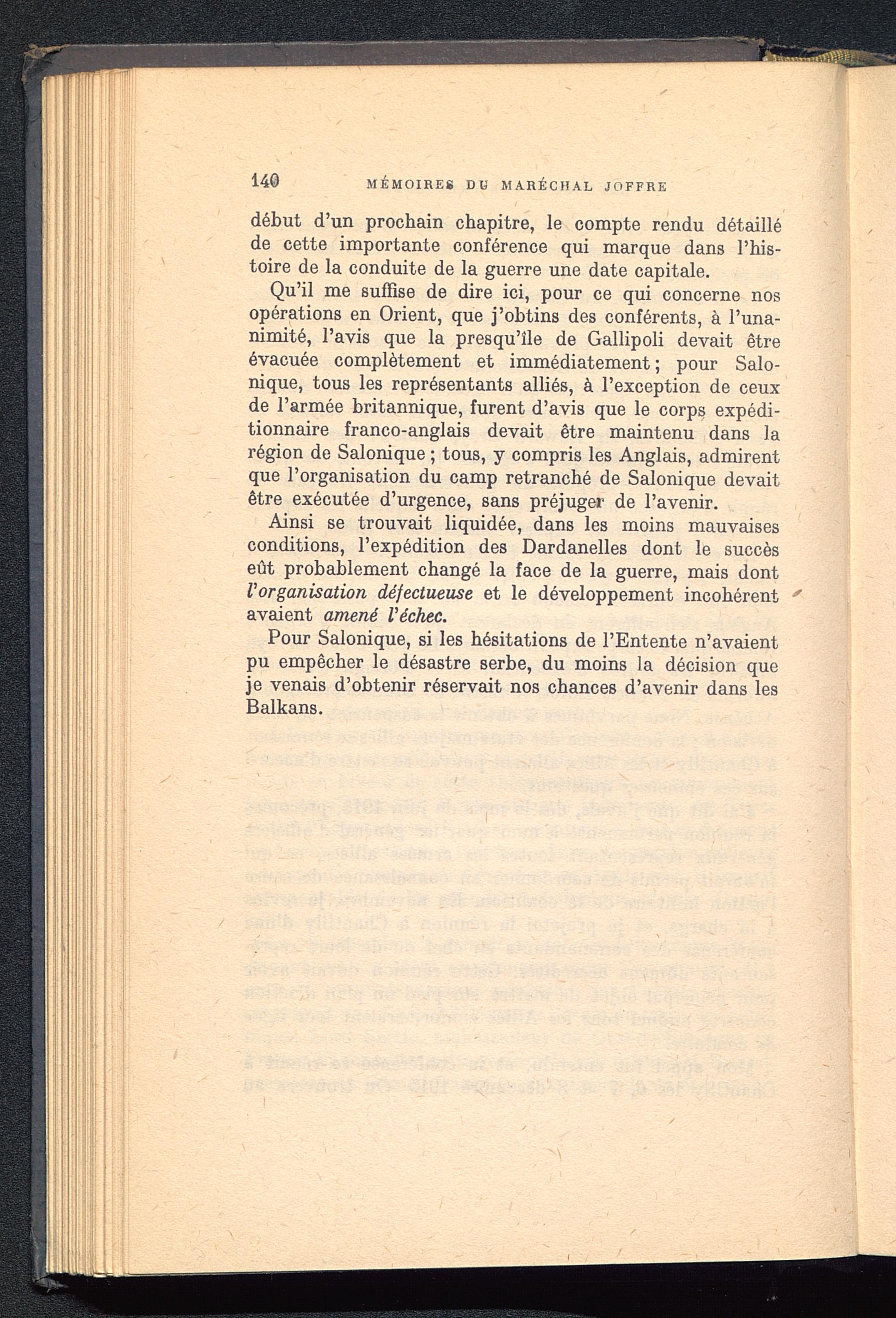 Qu’il me suffise de dire ici, pour ce qui concerne nosopérations en Orient, que j’obtins des conférents, à l’una-nimité, l’avis que la presqu’île de Gallipoli devait êtreévacuée complètement et immédiatement ; pour Salo-nique, tous les représentants alliés, à l’exception de ceuxde l’armée britannique, furent d’avis que le corps expédi-tionnaire franco-anglais devait être maintenu dans larégion de Salonique ; tous, y compris les Anglais , admirentque l’organisation du camp retranché de Salonique devaitêtre exécutée d’urgence, sans préjuger de l’avenir.