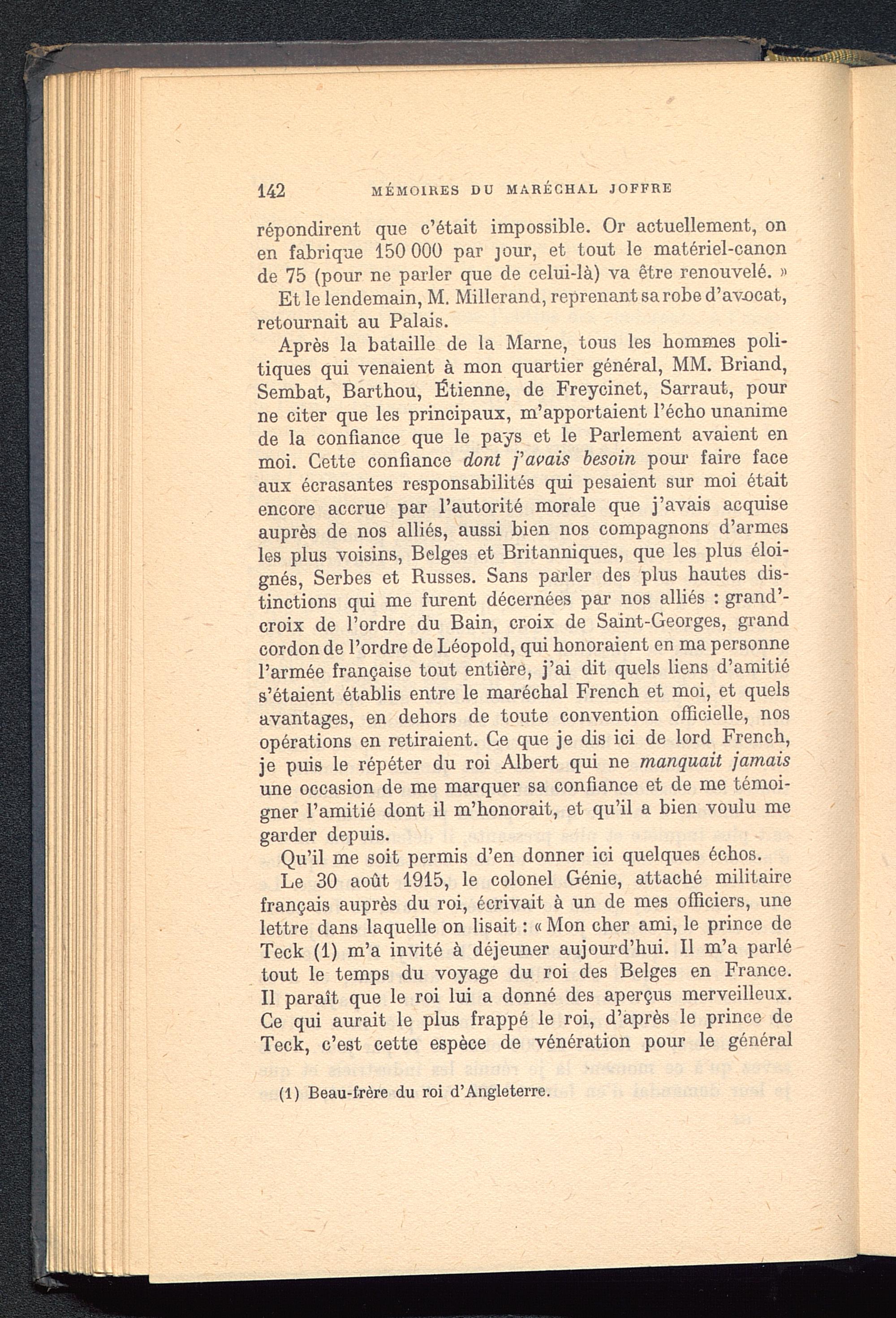 Le 30 août 1915, le colonel Génie, attaché militairefrançais auprès du roi, écrivait à un de mes officiers, unelettre dans laquelle on lisait : « Mon cher ami, le prince deTeck (1) m’a invité à déjeuner aujourd’hui. Il m’a parlétout le temps du voyage du roi des Belges en France. Il paraît que le roi lui a donné des aperçus merveilleux.Ce qui aurait le plus frappé le roi, d’après le prince deTeck, c’est cette espèce de vénération pour le général