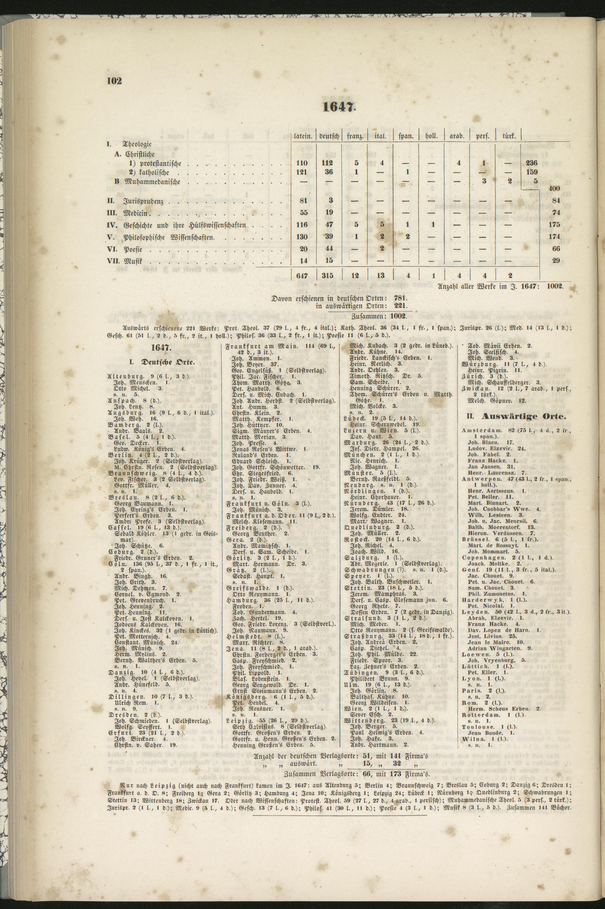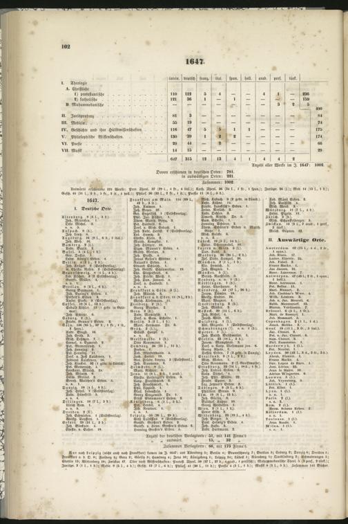 Nur nach Leipzig (nicht auch nach Frankfurt) kamen im I. IS47: aus Altenburg 5; Berlin 4; Braunschweig 7; Breslau 5; Coburg 2; Danzig «; Dresden I;Frankfurt a. d. O. 8; Freiberg I; Gera 2; Görlitz 3; Hamburg 4; Jena 10; Königsberg I; Leipzig 24; Lübeck I; Nürnberg I; Quedlinburg 2; Schwabrungen I;Stettin 13; Wittenberg 18; Zwickau 17. Oder nach Wissenschaften: Protest. Theol. 59 (27 l., 27 d., 4 arab., i persisch); Muhammedanische Theol. 5 (3 pers, 2 türk.);Jurispr. 2 (I l., I d>); Medic. 9 (5 l., 4 d.); Gesch. 13 (7 l., K d.); Philos. 41 (30 l., II d.); Poesie 4 (3 l., I d.); Musik 8 (3 l-, 5 d.). Zusammen 141 Bücher.