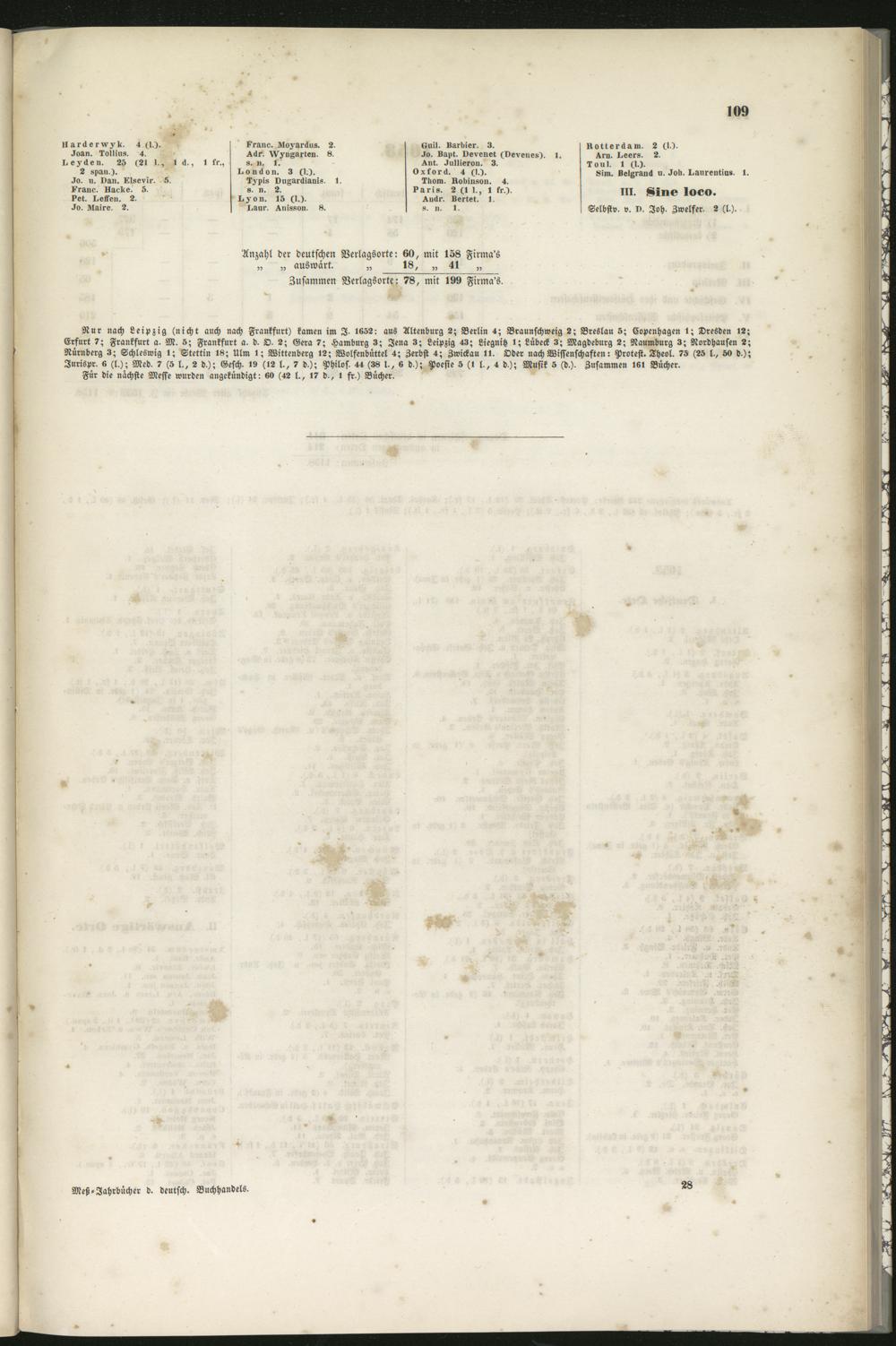 Nur nach Leipzig (nicht auch nach Frankfurt) kamen im I. 1652: aus Altenburg 2; Berlin 4; Braunschweig 2; Breslau 5; Kopenhagen 1; Dresden 12;Erfurt 7; Frankfurt a. M. 5; Frankfurt a. d. O- 2; Gera 7; Hamburg 3; Jena 3; Leipzig 43; Liegnitz l; Lübeck 3; Magdeburg 2; Naumburg 3; Nordhausen 2;Nürnberg 3; Schleswig I; Stettin 18; Ulm 1; Wittenberg 12; Wolfenbüttel 4; Zerbst 4; Zwickau II. Oder nach Wissenschaften: Protest. Theol. 75 (25 l-, 50 d.);Jurispr. « (l.); Med. 7 (5 l., 2 d.); Gesch. is (12 l-, 7 d.); Philos. 44 (38 l., « d); Poesie 5 (I l., 4 d.); Musik 5 (d.). Zusammen 1KI Bücher.