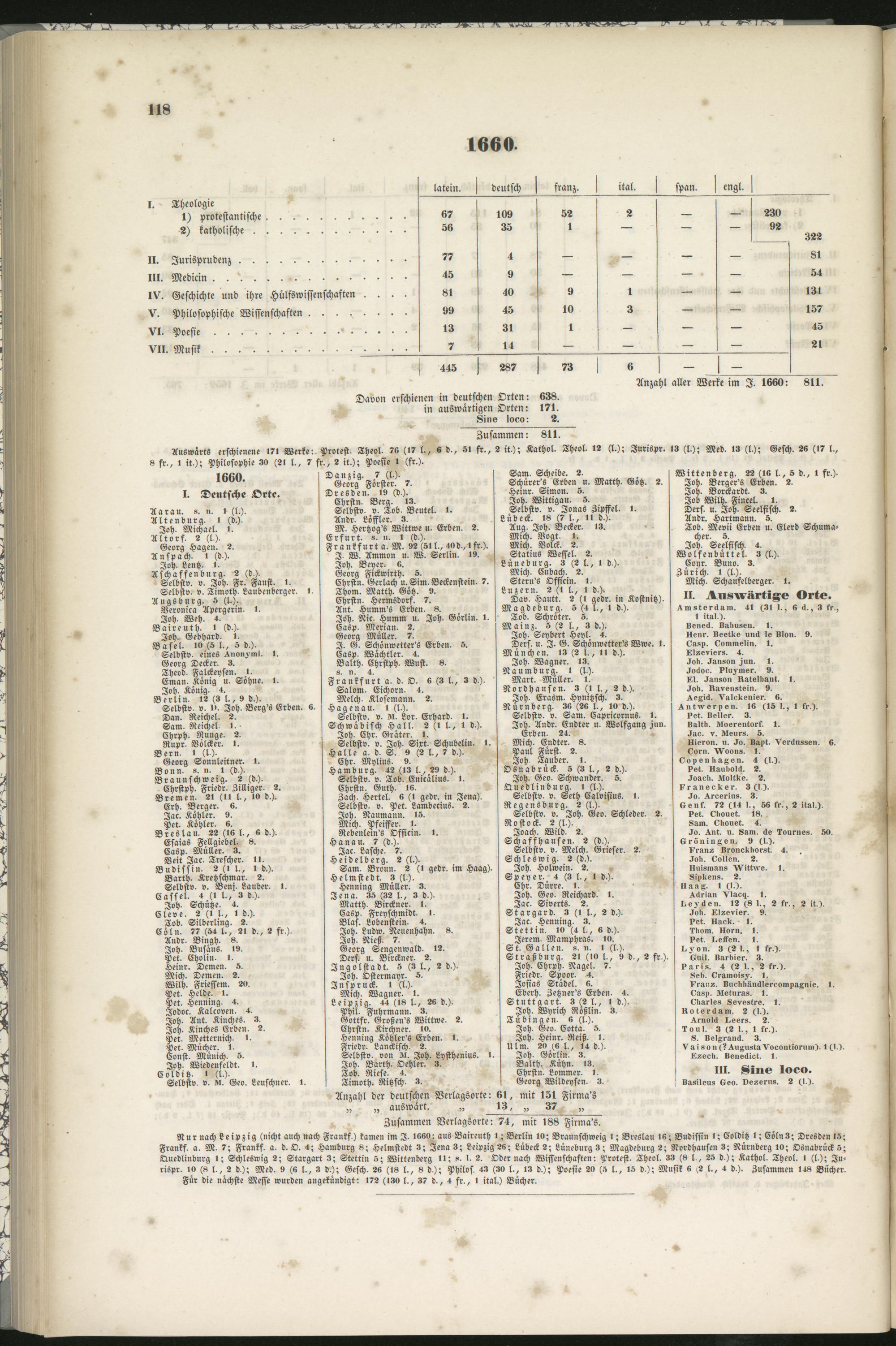 Zusammen Verlagsorte: 74, mit 188 Firma's.Nur nach Leipzig (nicht auch nach Franks) kamen im I, l««0: aus Baireuth l; Berlin lO; Braunschweig i; Breslau IS; Budissin 1; Colditz I; Cöln3; Dresden 15;Franks, a. M. 7; Franks, a. d. O. 4; Hamburg 8; Helmstedt 3; Jena 3; Leipzig 2«; Lübeck 2; Lüneburg 3; Magdeburg 2; Nordhause» 3; Nürnberg 10; Osnabrück 5;Quedlinburg i; Schleswig 2; Stargart 3; Stettin 5; Wittenberg II; ->. i. 2. Odernach Wissenschaften: Protest. Theol. 33 (8 l,, 25 d,); Kathol, Theol. I (l.); Ju-rispr. 10 (8 l-, 2 d): Med. 9 (« l., 3 d,); Gesch. 2« (18 l., 8 d.); Philos, 43 (30 l., l3 d.); Poesie 20 (5 l., 15 d); Musik e ^2 l., 4 d,). Zusammen 148 Bücher.Für die nächste Messe wurden angekündigt: 172 (130 l., 37 d., 4 fr., I ital.) Bücher.