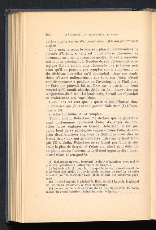 Tout d’abord, Robertson me déclara que le gouverne-ment britannique repoussait l’idée d’envoyer de nou-velles forces anglaises en Orient. Robertson, allant jus-qu’au bout de sa pensée, me suggéra même l’idée de rap-peler deux divisions anglaises de Salonique « où elles neferont rien » et « qui seraient très utiles sur le front fran-çais (3) ». Enfin, Robertson ne se faisait pas faute de dis-cuter le plan de Sarrail, et j’étais mal placé pour défendreun plan dont les fondements m’étaient apparus dès l’abordà moi-même si critiquables.