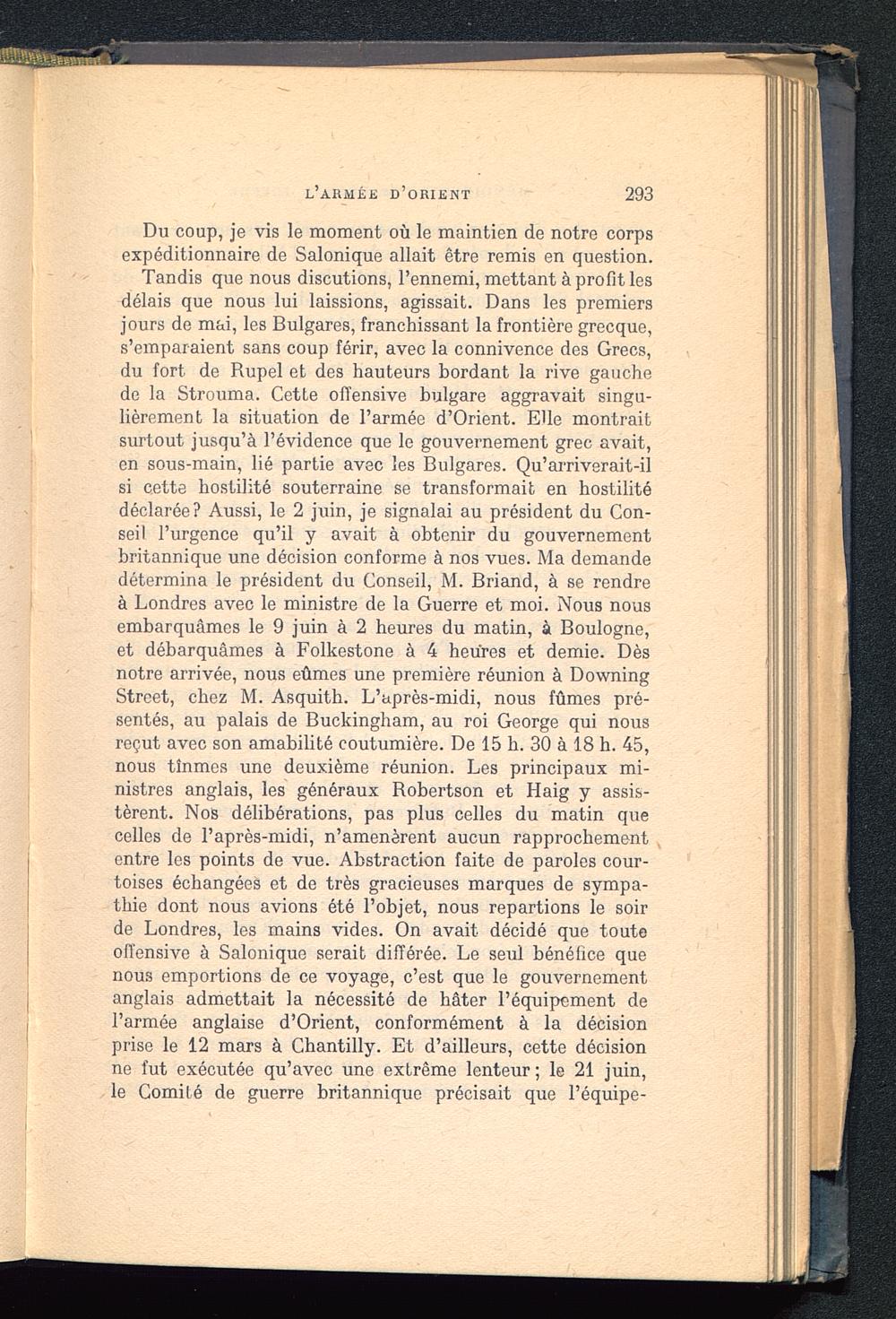 Tandis que nous discutions, l’ennemi, mettant à profit lesdélais que nous lui laissions, agissait. Dans les premiersjours de mai, les Bulgares, franchissant la frontière grecque,s’emparaient sans coup férir, avec la connivence des Grecs,du fort de Rupel et des hauteurs bordant la rive gauchede la Strouma . Cette offensive bulgare aggravait singu-lièrement la situation de l’armée d’Orient. EUe montraitsurtout jusqu’à l’évidence que le gouvernement grec avait,en sous-main, lié partie avec les Bulgares. Qu’arriverait-ilsi cette hostilité souterraine se transformait en hostilitédéclarée? Aussi, le 2 juin, je signalai au président du Con-seil l’urgence qu’il y avait à obtenir du gouvernementbritannique une décision conforme à nos vues. Ma demandedétermina le président du Conseil, M. Briand, à se rendreà Londres avec le ministre de la Guerre et moi. Nous nousembarquâmes le 9 juin à 2 heures du matin, à Boulogne,et débarquâmes à Folkestone à 4 heures et demie. Dèsnotre arrivée, nous eûmes une première réunion à DowningStreet , chez M. Asquith. L’après-midi, nous fûmes pré-sentés, au palais de Buckingham , au roi George qui nousreçut avec son amabilité coutumière. De 15 h. 30 à 18 h. 45,nous tînmes une deuxième réunion. Les principaux mi-nistres anglais , les généraux Robertson et Haig y assis-tèrent. Nos délibérations, pas plus celles du matin quecelles de l’après-midi, n’amenèrent aucun rapprochemententre les points de vue. Abstraction faite de paroles cour-toises échangées et de très gracieuses marques de sympa-thie dont nous avions été l’objet, nous repartions le soirde Londres , les mains vides. On avait décidé que touteoffensive à Salonique serait différée. Le seul bénéfice quenous emportions de ce voyage, c’est que le gouvernementanglais admettait la nécessité de hâter l’équipement del’armée anglaise d’Orient, conformément à la décisionprise le 12 mars à Chantilly. Et d’ailleurs, cette décisionne fut exécutée qu’avec une extrême lenteur ; le 21 juin,le Comité de guerre britannique précisait que l’équipe-