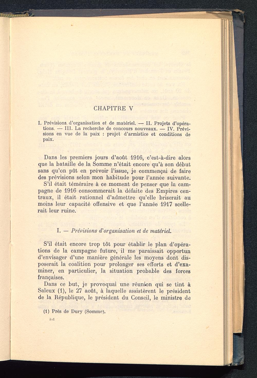 Dans les premiers jours d’août 1916, c’est-à-dire alorsque la bataille de la Somme n’était encore qu’à son débutsans qu’on pût en prévoir l’issue, je commençai de fairedes prévisions selon mon habitude pour l’année suivante.