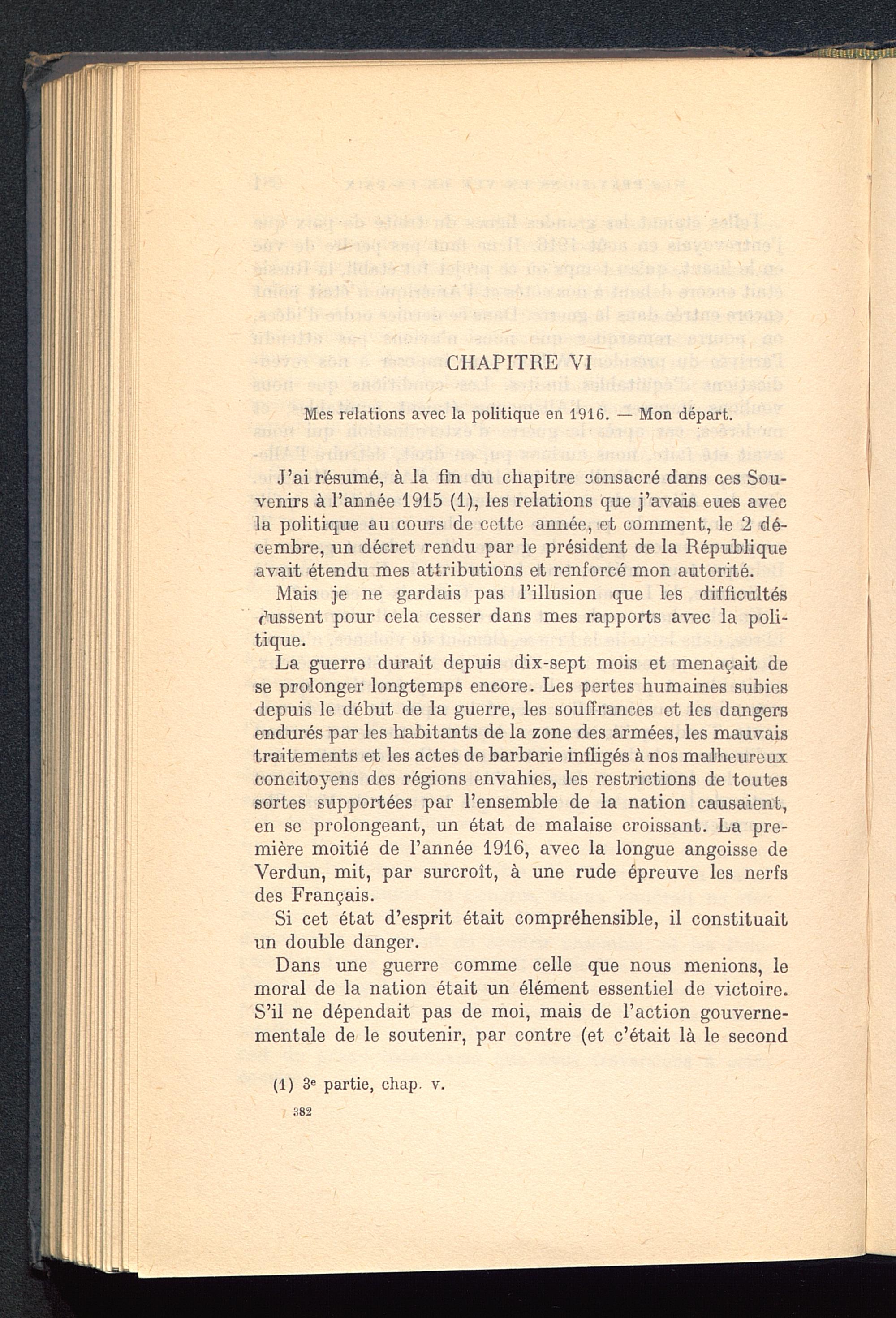 J’ai résumé, à la fin du chapitre consacré dans ces Sou-venirs à l’année 1915 (1), les relations que j’avais eues avecla politique au cours de cette année, et comment, le 2 dé-cembre, un décret rendu par le président de la Républiqueavait étendu mes attributions et renforcé mon autorité.