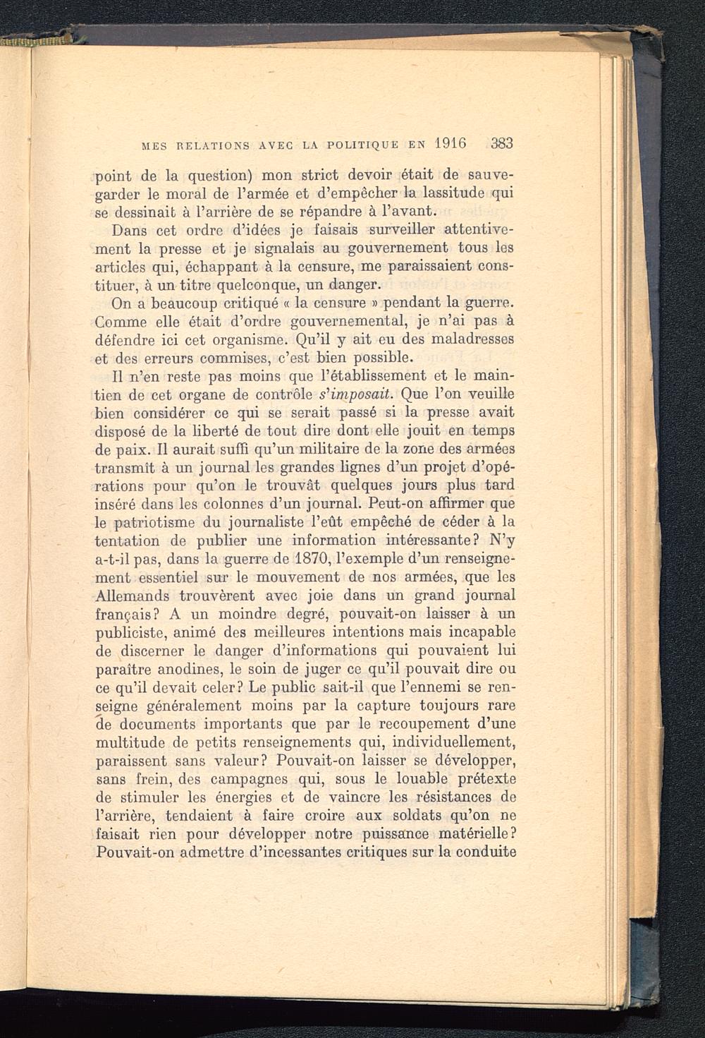 point de la question) mon strict devoir était de sauve-garder le moral de l’armée et d’empêcher la lassitude quise dessinait à l’arrière de se répandre à l’avant.