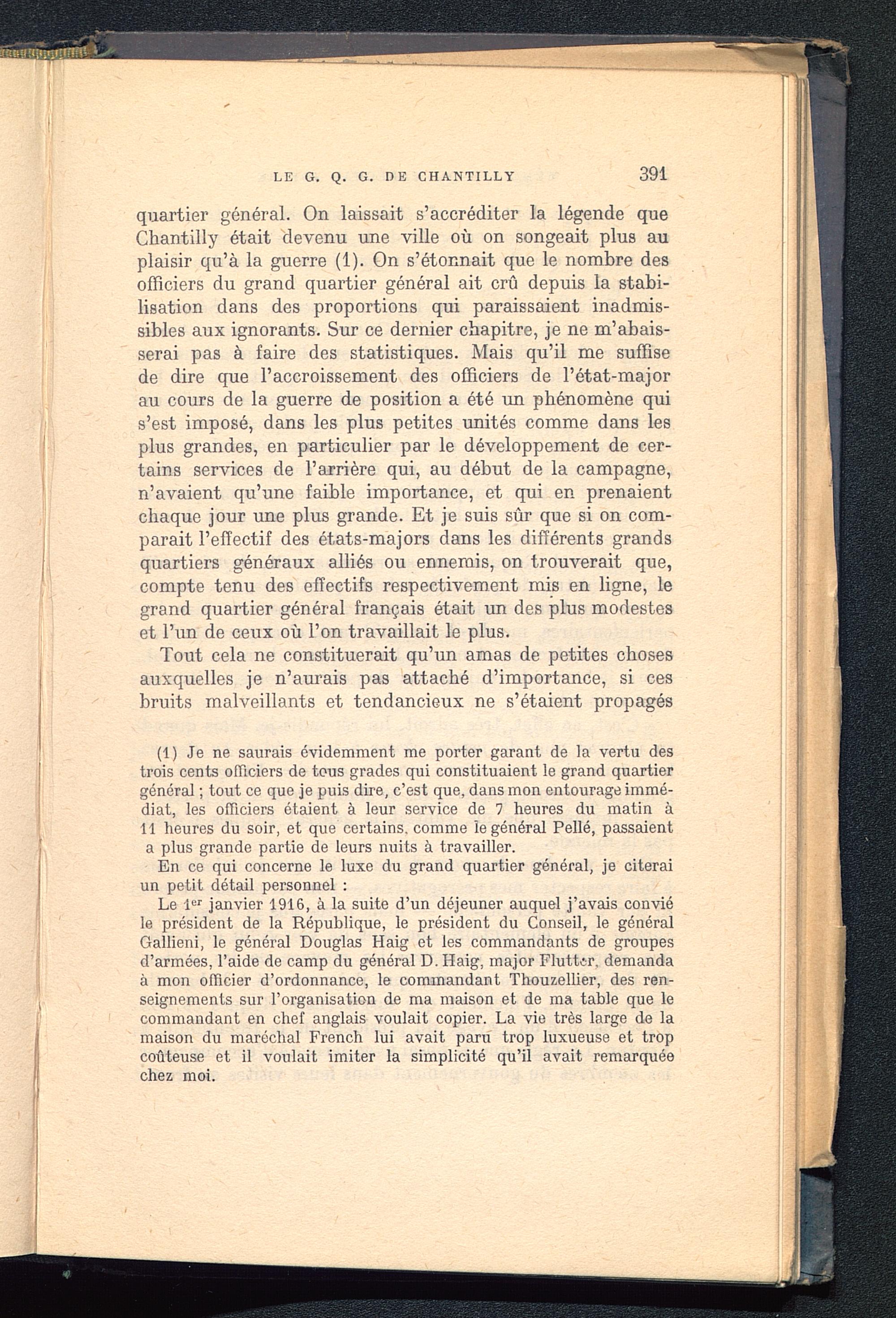 (1) Je ne saurais évidemment me porter garant de la vertu destrois cents officiers de tous grades qui constituaient le grand quartiergénéral ; tout ce que je puis dire, c’est que, dans mon entourage immé-diat, les officiers étaient à leur service de 7 heures du matin à11 heures du soir, et que certains, comme le général Pellé, passaienta plus grande partie de leurs nuits à travailler.