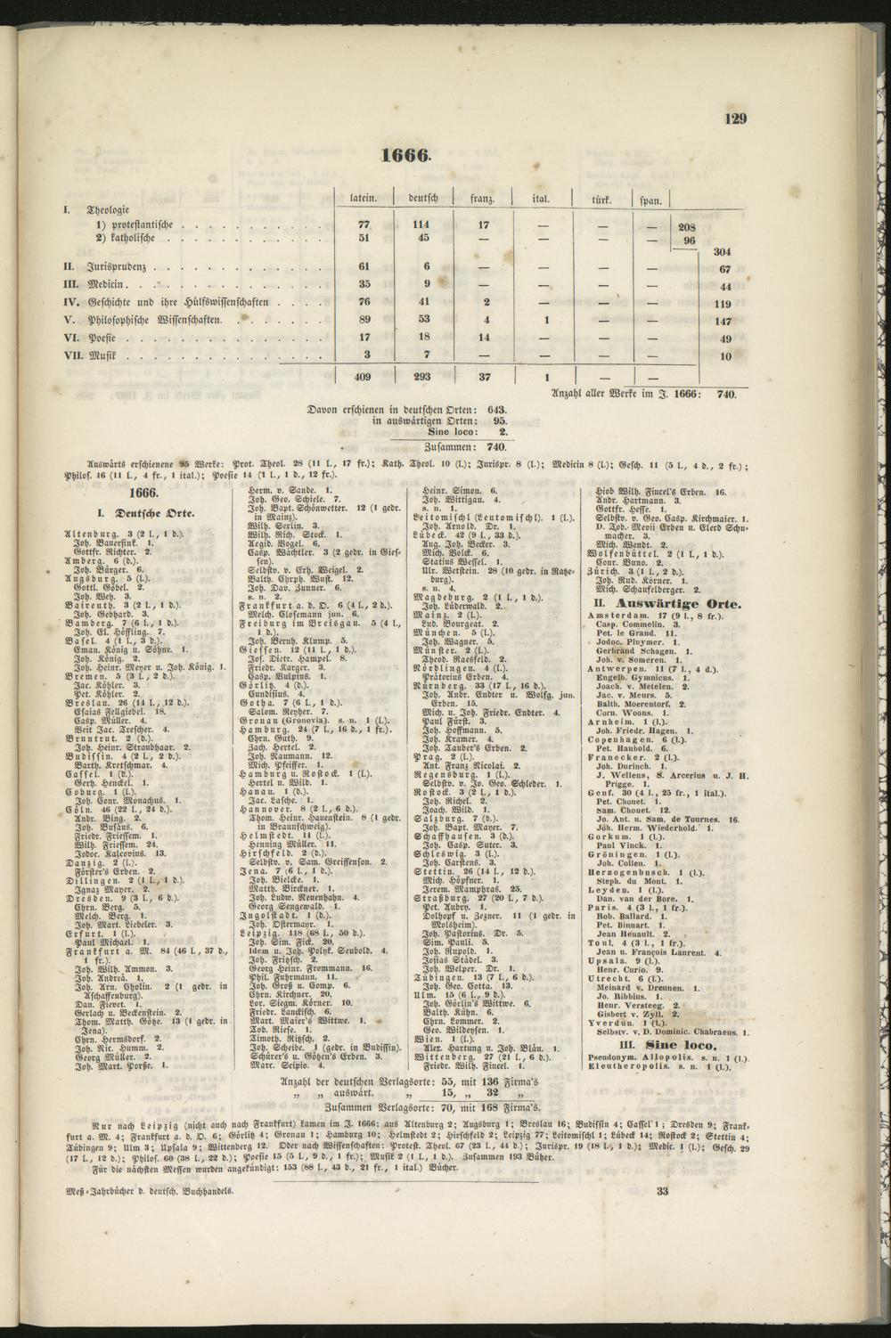 Nur nach Leipzig (nicht auch nach Frankfurt) kamen im I. l«k«: aus Altenburg 2; Augsburg l; Breslau l«; Budissin 4; Cassel l ; Dresden 9; Frank-furt a. M. 4; Frankfurt a. d. O. «; Görlitz 4; Gronau l; Hamburg lv; Helmstedt 2; Hirschfeld 2; Leipzig 77; Leitomischl I; Lübeck 14; Rostock 2; Stettin 4;Tübingen 9; Ulm 3; Upsala 9; Wittenberg l2. Oder nach Wissenschaften: Protest. Theol. K7 (23 l., 44 d,); Jurispr. 19 (l8 l., 1 d,); Medic. I (l.); Gesch. 29(l? l., IS d.); Philos. «o (38 l., 22 d.): Poesie 15 (5 l., 9 d., I fr.); Musik 2 (I l., I d.). Zusammen >93 Büher.