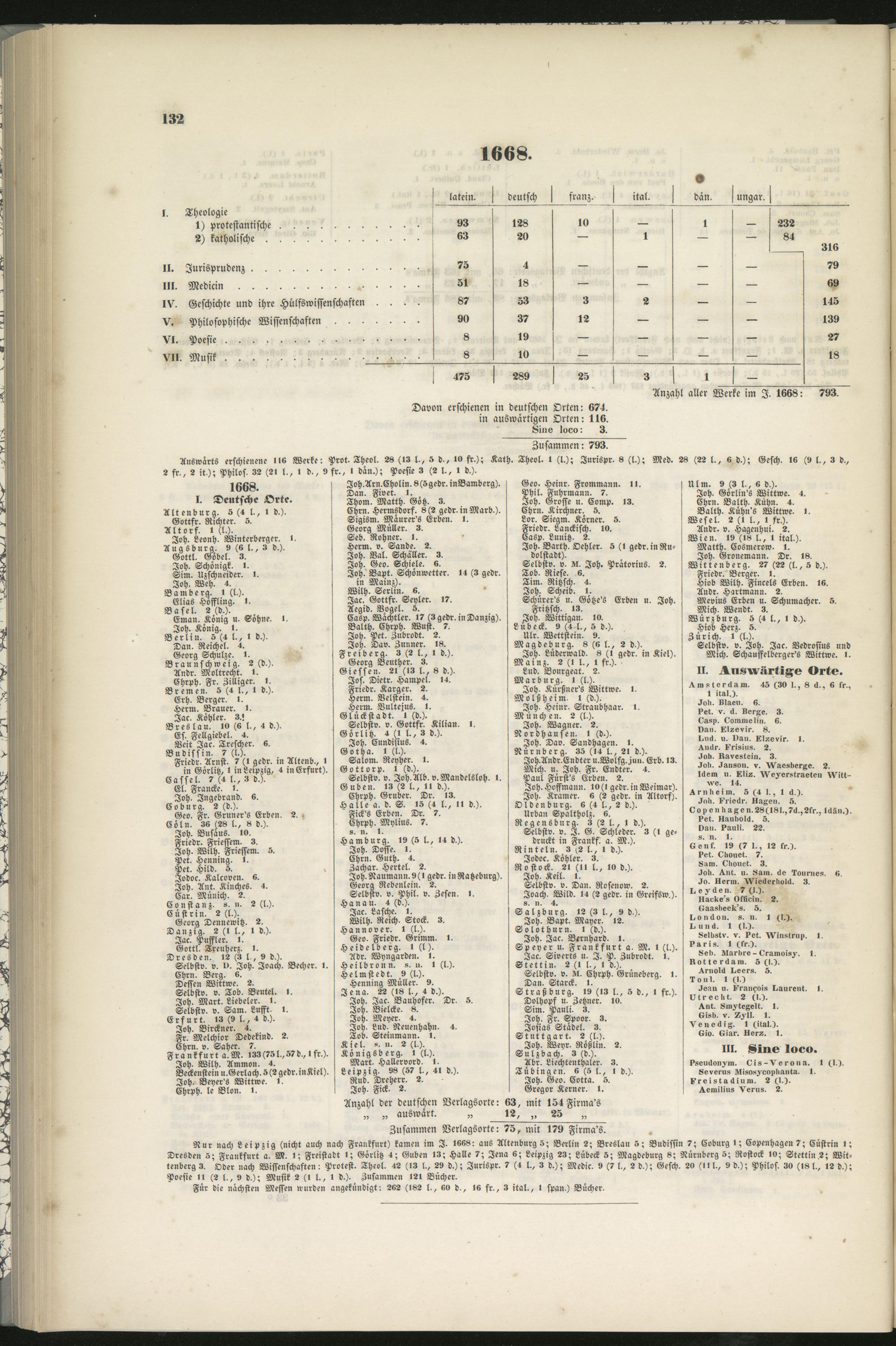 Zusammen Verlagsorte: 75, mit 179 Firma's.Nur nach Leipzig (nicht auch nach Frankfurt) kamen im I. I6«8: aus Altenburg 5; Berlin 2; Breslau 5; Budissin 7; Coburg I; Kopenhagen ?; Cüstrin i;Dresden 5; Frankfurt a. M. I: Freistadt i; Görlitz 4; Guben 13; Halle 7; Jena «; Leipzig 23; Lübeck 5; Magdeburg 8; Nürnberg 5; Rostock 10; Stettin,2; Wit-ch Wissenschaften: Protest. Theol. 42 (13 >., 29 d.); Jurispr. 7 (4 l., 3 d.); Medic. 9 (7 l., 2 d.); Gesch. 2» (IN., 9 d-); Philos. 30 (18 l-, 12 d.);>.); Musik 2 (I l., 1 d.). Zusammen 121 Bücher.