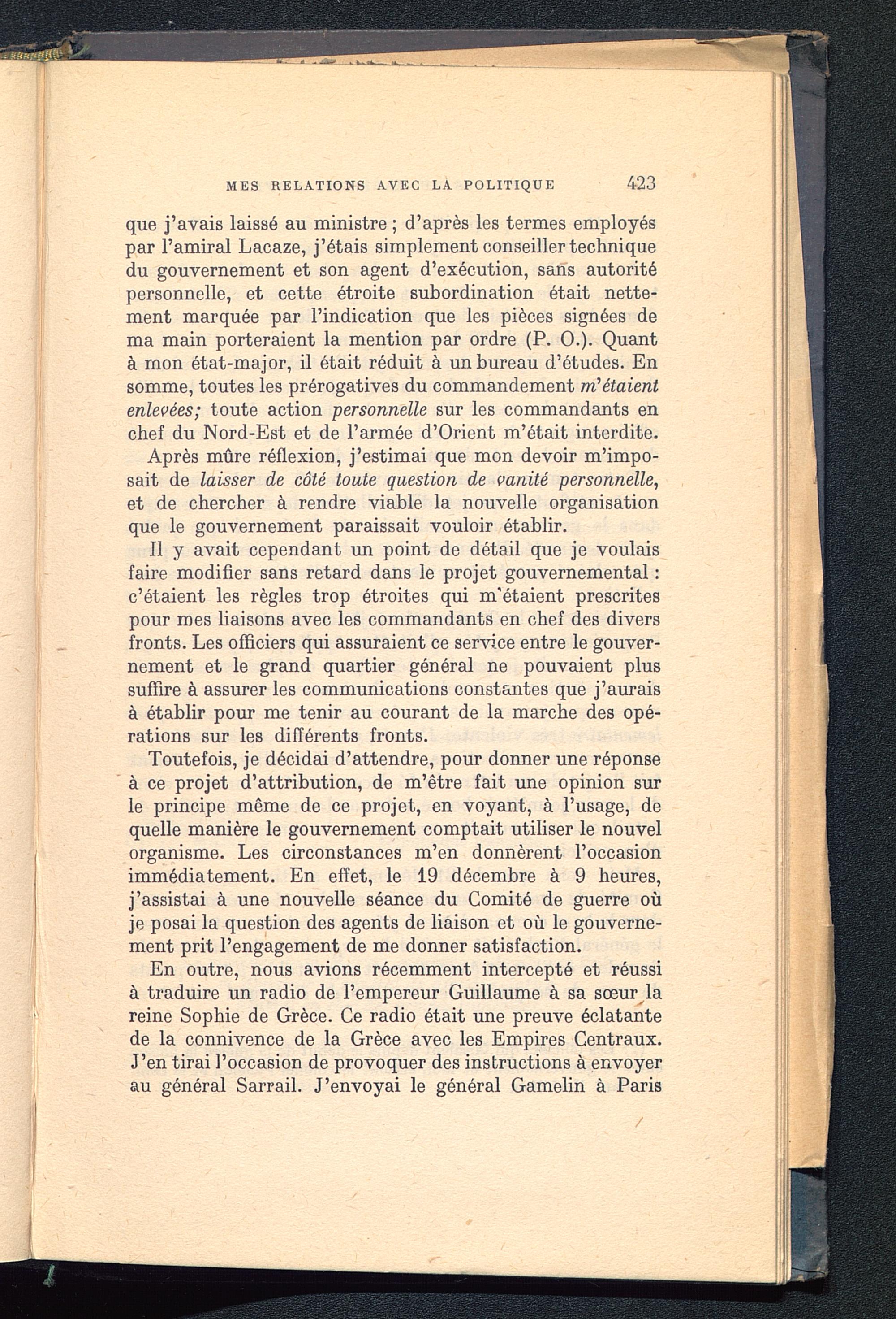 En outre, nous avions récemment intercepté et réussià traduire un radio de l’empereur Guillaume à sa sœur lareine Sophie de Grèce. Ce radio était une preuve éclatantede la connivence de la Grèce avec les Empires Centraux.J’en tirai l’occasion de provoquer des instructions à envoyerau général Sarrail. J’envoyai le général Gamelin à Paris