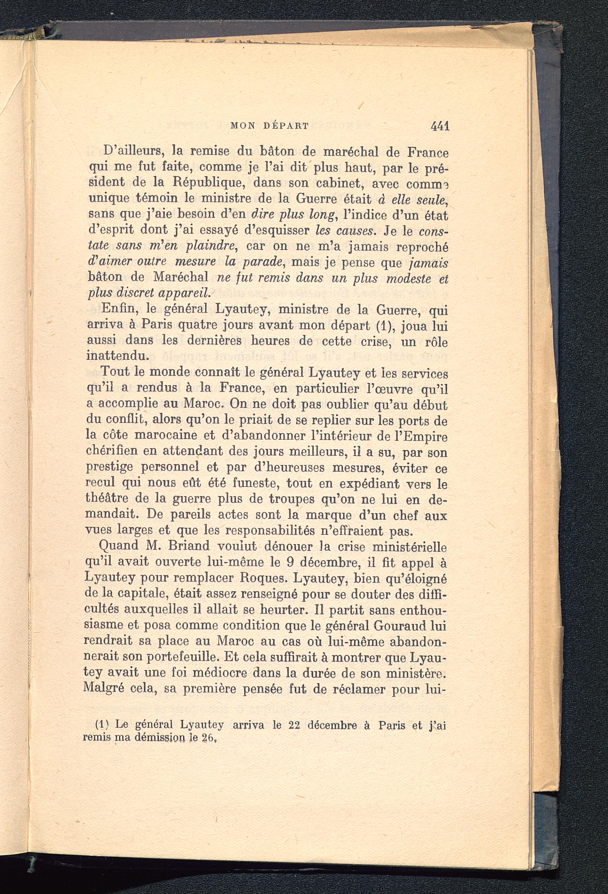 (1) Le général Lyautey arriva le 22 décembre à Paris et j’airemis ma démission le 26,