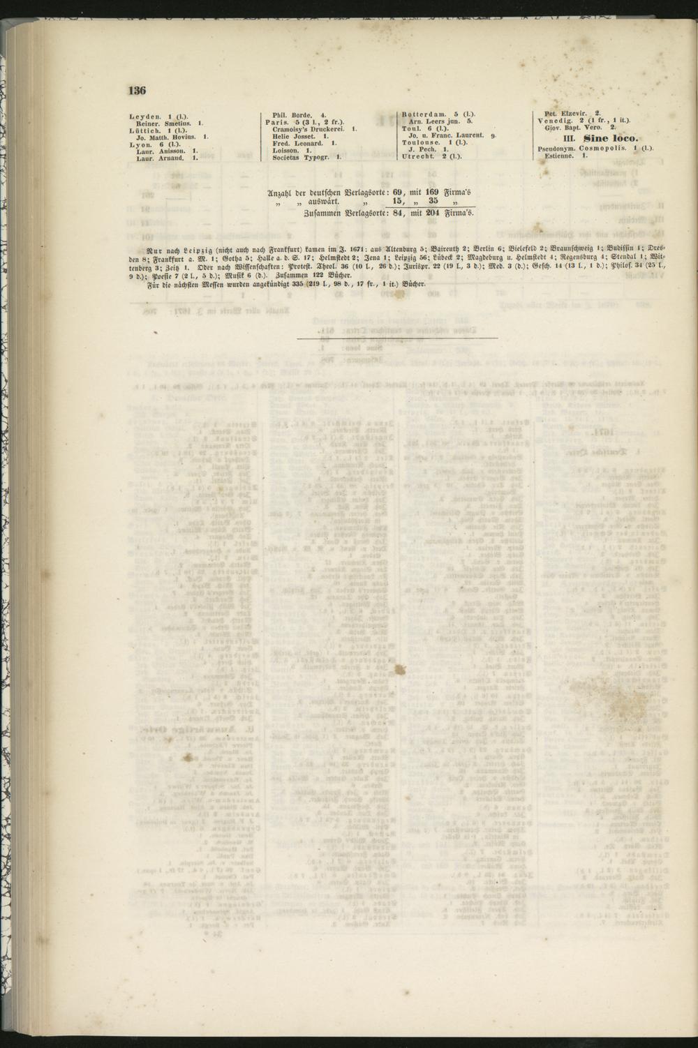 Nur nach Leipzig (nicht auch nach Frankfurt) kamen im I. l«7l: aus Altenburg 5; Baireuth 2; Berlin «; Bielefeld 2; Braunschweig l; Budissin l; Dres-den 8; Frankfurt a. M. l; Gotha 5; Halle a. d. S. 17; Helmstedt2; Jena !; Leipzig 36; Lübeck 2; Magdeburg u. Helmstedt 4; Regensburg 4; Stendal >; Wit-tenberg 3; Zeitz l. Oder nach Wissenschaften: Protest. Theol. 3« (w l-, 26 d.); Zurispr. 22 (li> l., 3 d.); Med. 3 (d.); Gesch. l4 (,3 l., l d ); Philos. 34 (23 l,,9 d.); Poesie 7 (2 l., s d.); Musik 6 (d.). Zusammen l22 Bücher.