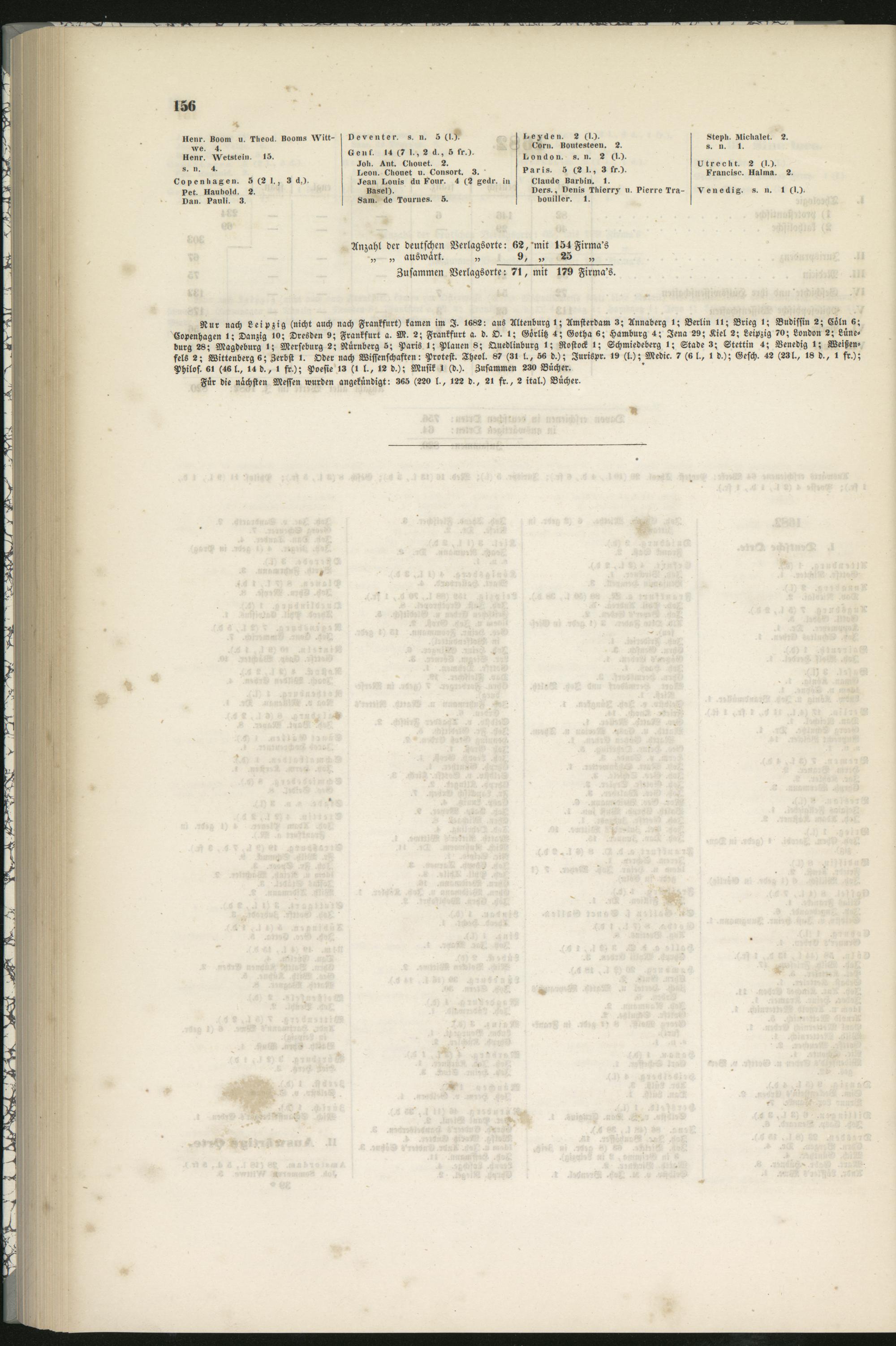 Nur nach Leipzig (nicht auch nach Frankfurt) kamen im I. l«82: aus Altenburg t; Amsterdam 3; Annaberg i; Berlin tt; Brieg t; Budissin 2; Cöln K;Copenhagen t; Danzig i»; Dresden 9; Frankfurt a. M. 2; Frankfurt a. d. O. t; Görlitz 4; Gotha «; Hamburg 4; Jena 29; Kiel 2; Leipzig 70; London 2; Lüne«bürg 28; Magdeburg l; Merseburg 2; Nürnberg 5; Paris l; Planen 8; Quedlinburg t; Rostock t; Schmiedeberg l; Stade 3; Stettin 4; Venedig t; Weißen-fels 2; Wittenberg «; Zerbst I. Oder nach Wissenschaften: Protest. Theol. 87 (3t l., S6 d.); Iurispr. lS (l.); Medic. 7 (6 l., l d.); Gesch. 42 (23l., 18 d., I fr.);Philos. ei (46 l., t4 d., t st.); Poesie l3 (i l., t2 d.); Musik t (d.). Zusammen 230 Bücher.
