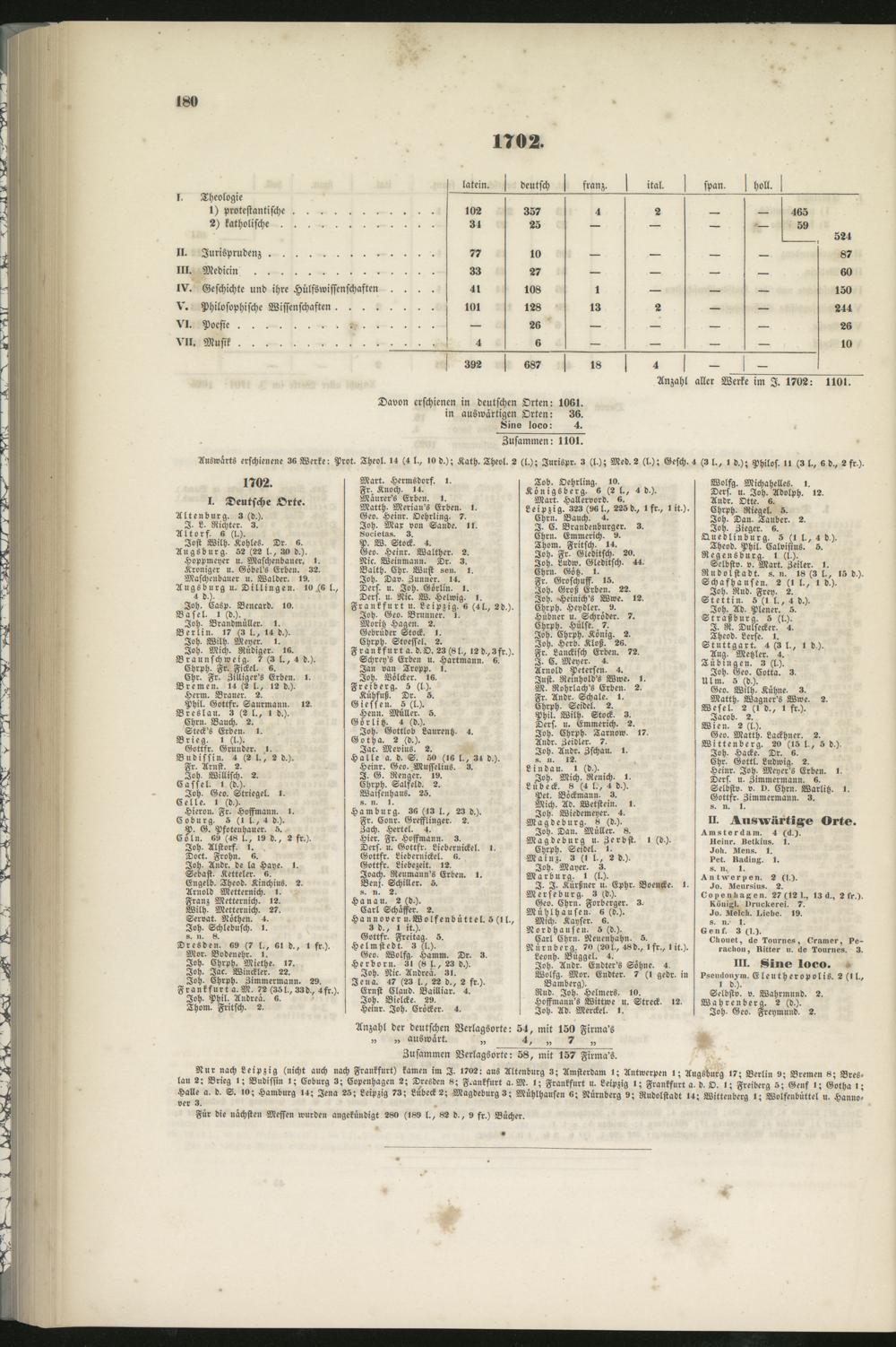 Nur nach Leipzig (nicht auch nach Frankfurt) kamen im I. 1702: aus Altenburg 3; Amsterdam i; Antwerpen I; Augsburg 17; Berlin 9; Bremen 8; Bres-lau 2: Brieg i; Budissin I; Coburg 3; Kopenhagen 2; Dresden 8; Frankfurt a.M, I; Frankfurt u. Leipzig I; Frankfurt a, d, O. I; Freiberg 5; Genf I; Gotha I;Halle a. d. S. 10; Hamburg 14; Jena 25; Leipzig 73; Lübeck 2; Magdeburg 3; Mühlhausen «; Nürnberg 9; Rudolstadt 14; Wittenberg 1; Wolfenbüttel u. Hanno-ver 3.