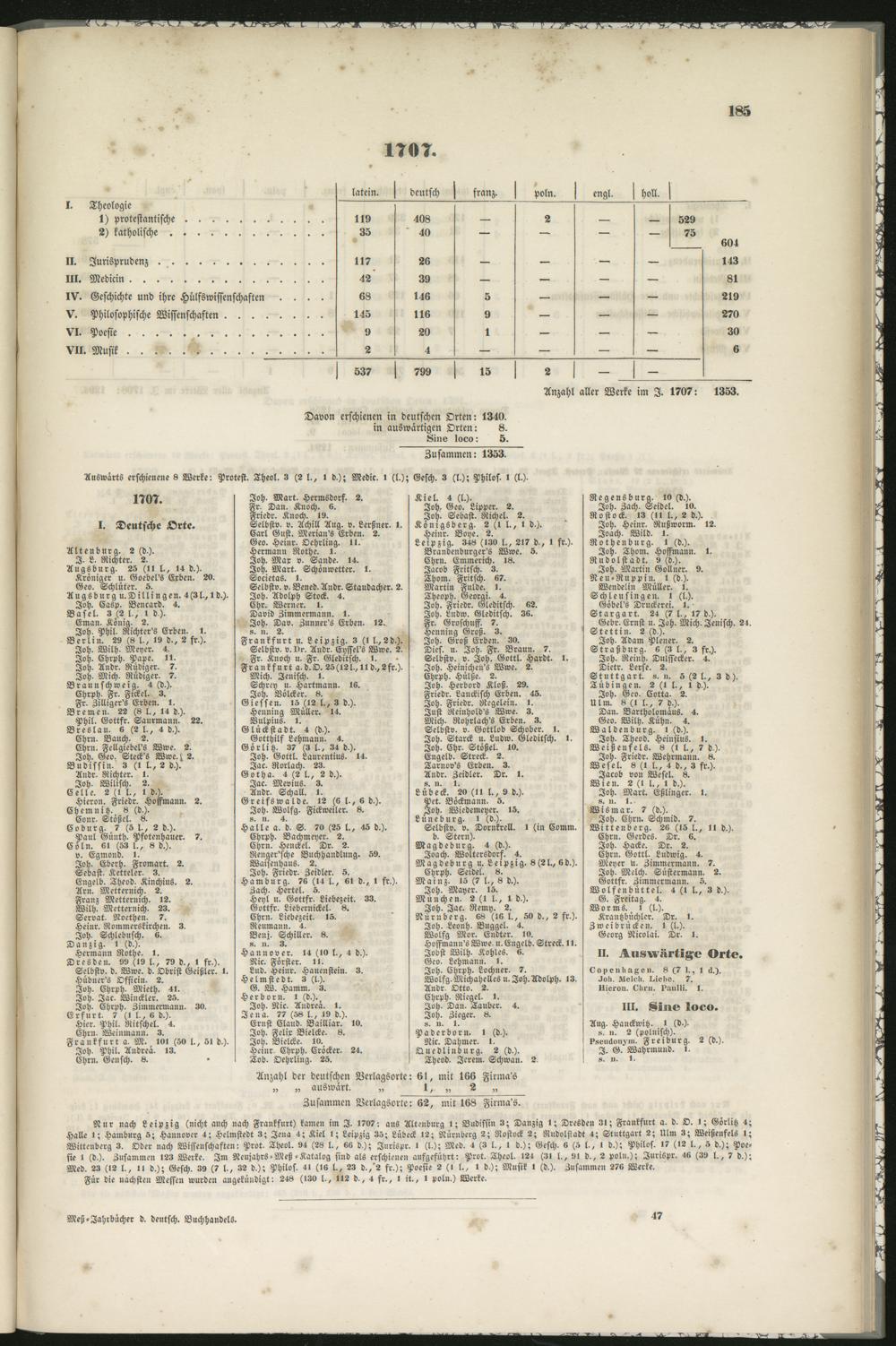 Halle i; Hamvurg 5; Hannover 4; «elm>revr »: ^ena 4; «,iel 1; Leipzig its; Luve« 12; Nurnverg Nviro« Rudolstadt 4; Stuttgart 2; Ulm 3; Weißenfels I;Wittenberg 3. Oder nach Wissenschaften: Prot, Theol. 94 (28 l., 6« d,); Jurispr. 1 (l,); Med. 4 (3 l., t d.); Gesch. 6 (5 l,, 1 d.): Philos. 17 (12 l., 5 d.); Poe-sie 1 (d.). Zusammen 123 Werke. Im Neujahrs-Meß-Katalog sind als erschienen aufgeführt: Prot. Theol. 124 (31 l,, i>> d., 2 poln.); Jurispr. 4K (39 l., 7 d.):Med. 23 (12 l., 11 d.); Gesch. 39 (7 l., 32 d,); Philos. 41 (is l., 23 d.,'2 fr.); Poesie 2 (l l., 1 d,); Musik I (d,). Zusammen 276 Werke.