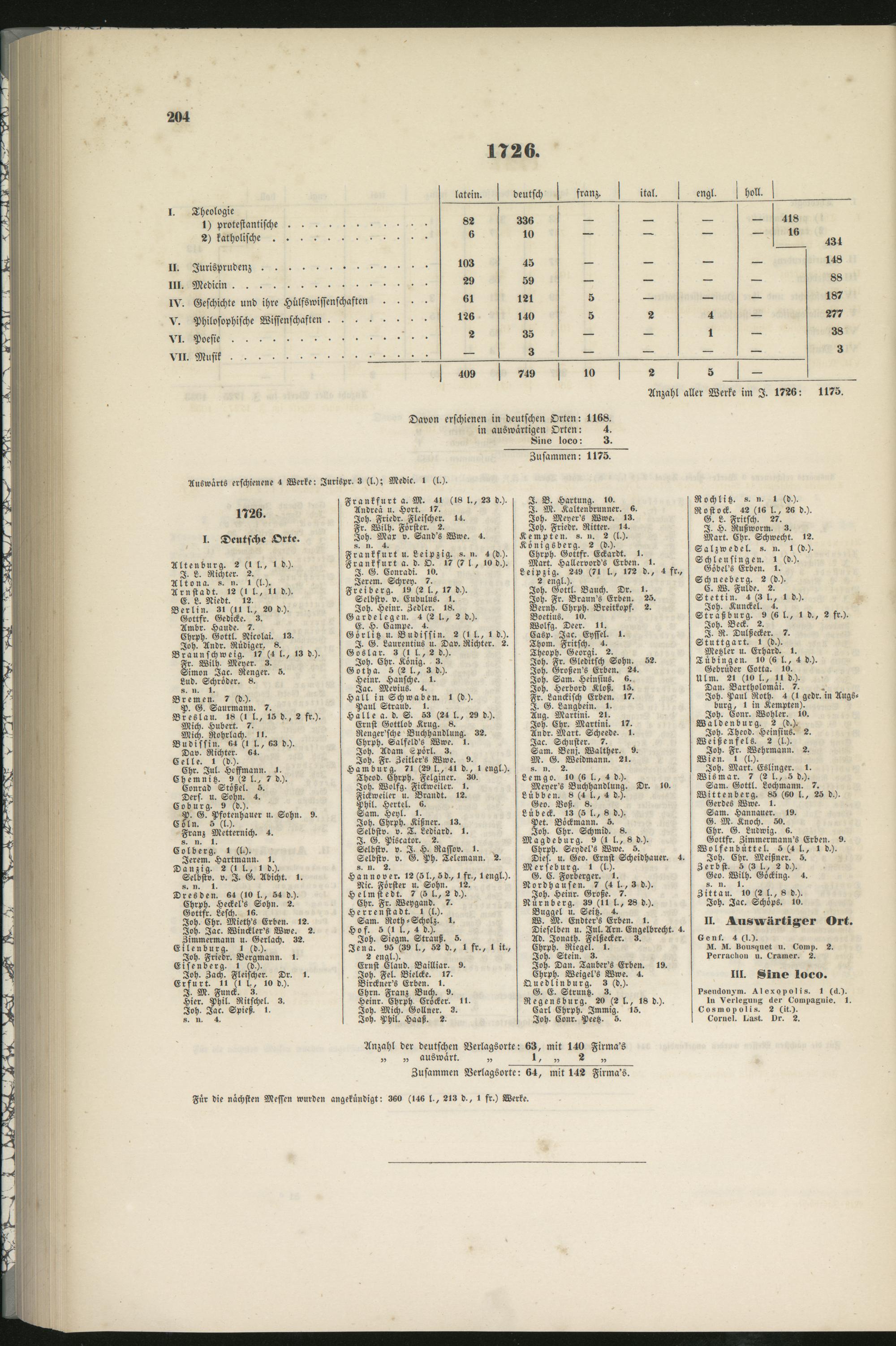 Anzahl der deutschen Verlagsorte: 63, mit 140 Firma's„ „ auswärt. „ 1, „ 2 „