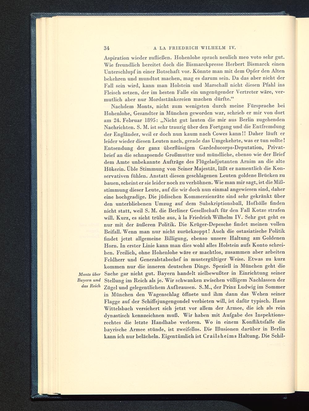 Nachdem Monts, nicht zum wenigsten durch meine Fürsprache beiHohenlohe, Gesandter in München geworden war, schrieb er mir von dortam 24. Februar 1895: „Nicht gut lauten die mir aus Berlin zugehendenNachrichten. S. M. ist sehr traurig über den Fortgang und die Entfremdungder Engländer, weil er doch nun kaum nach Cowes kann!! Daher läuft erleider wieder diesen Leuten nach, gerade das Umgekehrte, was er tun sollte!Entsendung der ganz überflüssigen Gardeducorps-Deputation, Privat-brief an die schnapsende Großmutter und mündliche, ebenso wie der Briefdem Amte unbekannte Aufträge des Flügeladjutanten Arnim an die alteHökerin. Üble Stimmung von Seiner Majestät, läßt er namentlich die Kon-servativen fühlen. Anstatt diesen geschlagenen Leuten goldene Brücken zubauen, seil eint er sie leider noch zu verhöhnen. Wie man mir sagt, ist die Miß-stimmung dieser Leute, auf die wir doch nun einmal angewiesen sind, dahereine hochgradige. Die jüdischen Kommerzienräte sind sehr gekränkt überden unterbliebenen Umzug auf dem Subskriptionsball, Hofbälle findennicht statt, weil S. M. die Berliner Gesellscbaft für den Fall Kotze strafenwill. Kurz, es sieht trübe aus, ä la Friedrich Wilhelm IV. Sehr gut geht esnur mit der äußeren Politik. Die Krüger-Depesche findet meinen vollenBeifall. Wenn man nur nicht zurückzoppt! Auch die ostasiatische Politikfindet jetzt allgemeine Billigung, ebenso unsere Haltung am GoldenenHorn . In erster Linie kann man dies wohl alles Holstein aufs Konto schrei-ben. Freilich, ohne Hohenlohe wäre er machtlos, zusammen aber arbeitenFeldherr und Generalstabschef in mustergültiger Weise. Etwas zu kurzkommen nur die inneren deutschen Dinge. Speziell in München geht dieMonis über Sache gar nicht gut. Bayern handelt zielbewußter in Einrichtung seinerBayern und Stellung im Reich als je. Wir schwanken zwischen völligem Nachlassen derZügel und gelegentlichem Aufbrausen. S.M., der Prinz Ludwig im Sommerin München den Wagenschlag öffnete und ihm dann das Wehen seinerFlagge auf der Schiffsjungengondel verbieten will, ist dafür typisch. HausWittelsbach versichert sich jetzt vor allem der Armee, die ich als reindynastisch kennzeichnen muß. Wir haben mit Aufgabe des Inspektions-rechtes die letzte Handhabe verloren. Wo in einem Konfliktsfalle diebayrische Armee stünde, ist zweifellos. Die Illusionen darüber in Berlin kann ich nur belächeln. Eigentümlich ist Crailsheims Haltung. Die Schii-