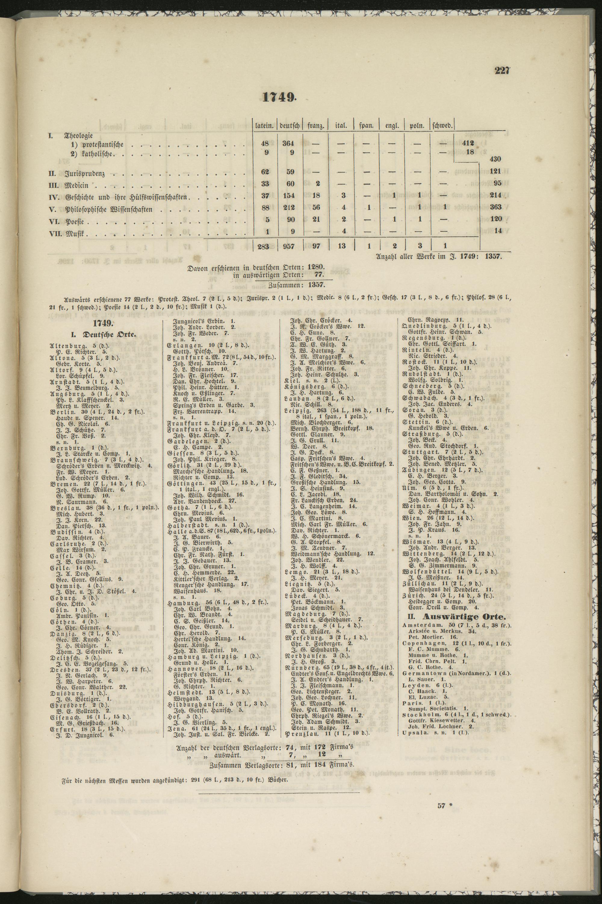 Anzahl der deutschen Verlagsorte: 74, mit 172 Firma's„ „ auswärt. „ 7, „ I S „