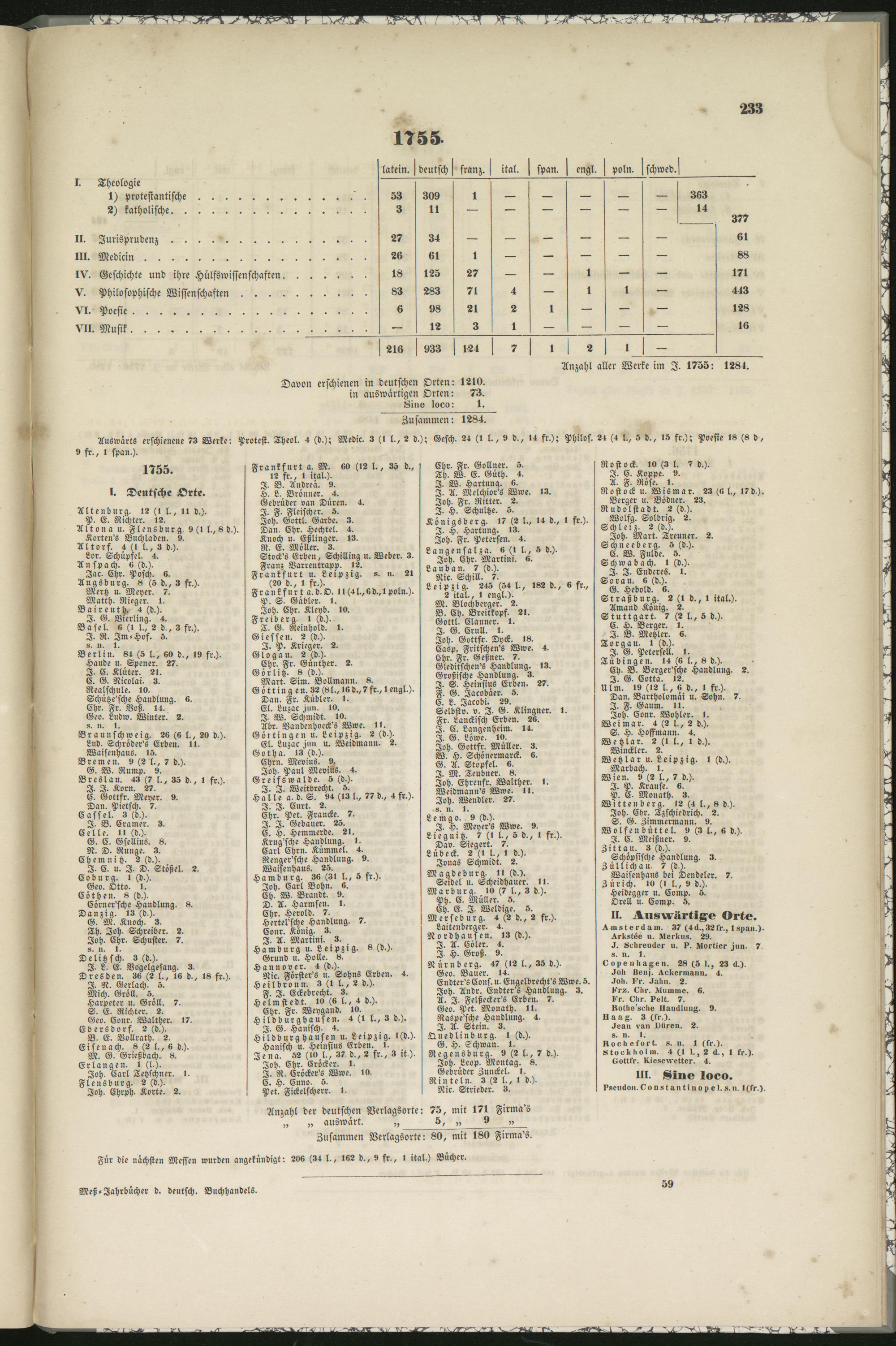 Anzahl der deutschen Verlagsorte: 75, mit 171 Firma's„ „ auswärt. „ 5, „ 9 „