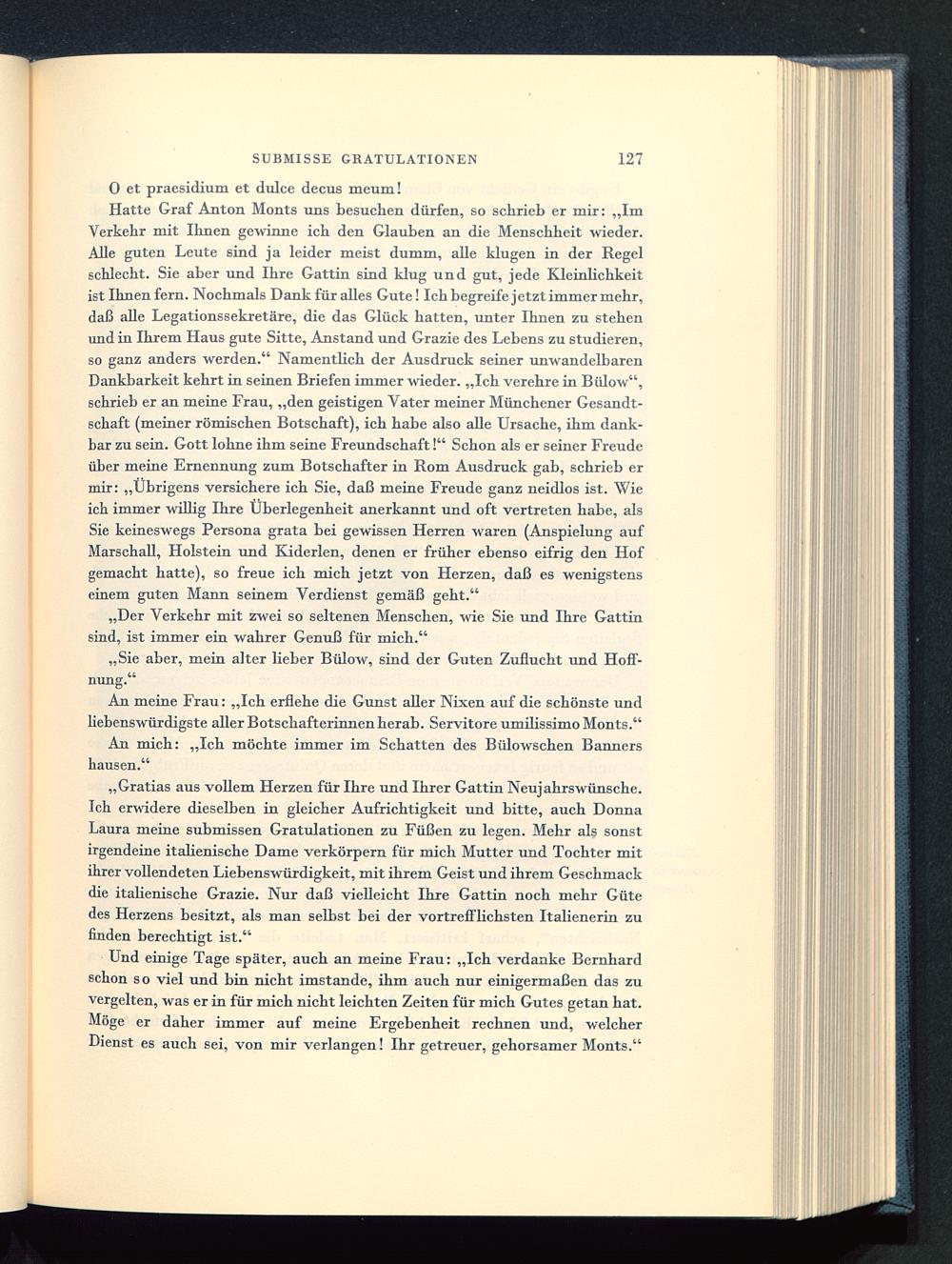 Hatte Graf Anton Monts uns besuchen dürfen, so schrieb er mir: „ImVerkehr mit Ihnen gewinne ich den Glauben an die Menschheit wieder.Alle guten Leute sind ja leider meist dumm, alle klugen in der Regelschlecht. Sie aber und Ihre Gattin sind klug und gut, jede Kleinlichkeitist Ihnen fern. Nochmals Dank für alles Gute! Ich begreife jetzt immer mehr,daß alle Legationssekretäre, die das Glück hatten, unter Ihnen zu stehenund in Ihrem Haus gute Sitte, Anstand und Grazie des Lebens zu studieren,so ganz anders werden." Namentlich der Ausdruck seiner unwandelbarenDankbarkeit kehrt in seinen Briefen immer wieder. „Ich verehre in Bülow",schrieb er an meine Frau, „den geistigen Vater meiner Münchener Gesandt-schaft (meiner römischen Botschaft), ich habe also alle Ursache, ihm dank-bar zu sein. Gott lohne ihm seine Freundschaft!" Schon als er seiner Freudeüber meine Ernennung zum Botschafter in Rom Ausdruck gab, schrieb ermir: „Übrigens versichere ich Sie, daß meine Freude ganz neidlos ist. Wieich immer willig Ihre Überlegenheit anerkannt und oft vertreten habe, alsSie keineswegs Persona grata bei gewissen Herren waren (Anspielung aufMarschall , Holstein und Kiderlen, denen er früher ebenso eifrig den Hofgemacht hatte), so freue ich mich jetzt von Herzen, daß es wenigstenseinem guten Mann seinem Verdienst gemäß geht."