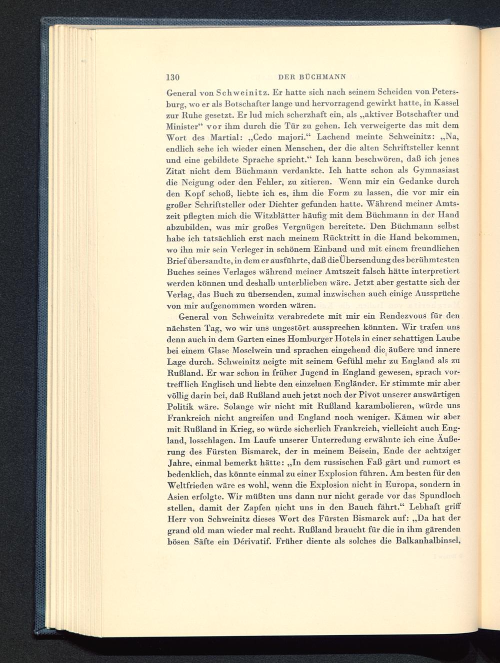 General von Schweinitz. Er hatte sich nach seinem Scheiden von Peters-burg, wo er als Botschafter lange und hervorragend gewirkt hatte, in Kassel zur Ruhe gesetzt. Er lud mich scherzhaft ein, als „aktiver Botschafter undMinister" vor ihm durch die Tür zu gehen. Ich verweigerte das mit demWort des Martial: „Cedo majori." Lachend meinte Schweinitz: „Na,endlich sehe ich wieder einen Menschen, der die alten Schriftsteller kenntund eine gebildete Sprache spricht." Ich kann beschwören, daß ich jenesZitat nicht dem Büchmann verdankte. Ich hatte schon als Gymnasiastdie Neigung oder den Fehler, zu zitieren. Wenn mir ein Gedanke durchden Kopf schoß, liebte ich es, ihm die Form zu lassen, die vor mir eingroßer Schriftsteller oder Dichter gefunden hatte. Während meiner Amts-zeit pflegten mich die Witzblätter häufig mit dem Büchmann in der Handabzubilden, was mir großes Vergnügen bereitete. Den Büchmann selbsthabe ich tatsächlich erst nach meinem Rücktritt in die Hand bekommen,wo ihn mir sein Verleger in schönem Einband und mit einem freundlichenBrief übersandte, in dem er ausführte, daß dieUbersendung des berühmtestenBuches seines Verlages während meiner Amtszeit falsch hätte interpretiertwerden können und deshalb unterblieben wäre. Jetzt aber gestatte sich derVerlag, das Buch zu übersenden, zumal inzwischen auch einige Aussprüchevon mir aufgenommen worden wären.