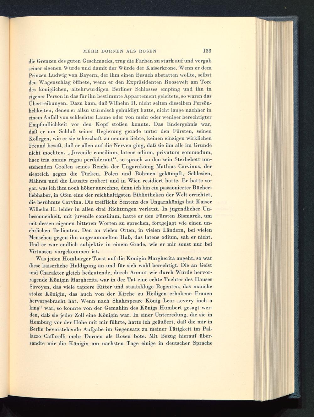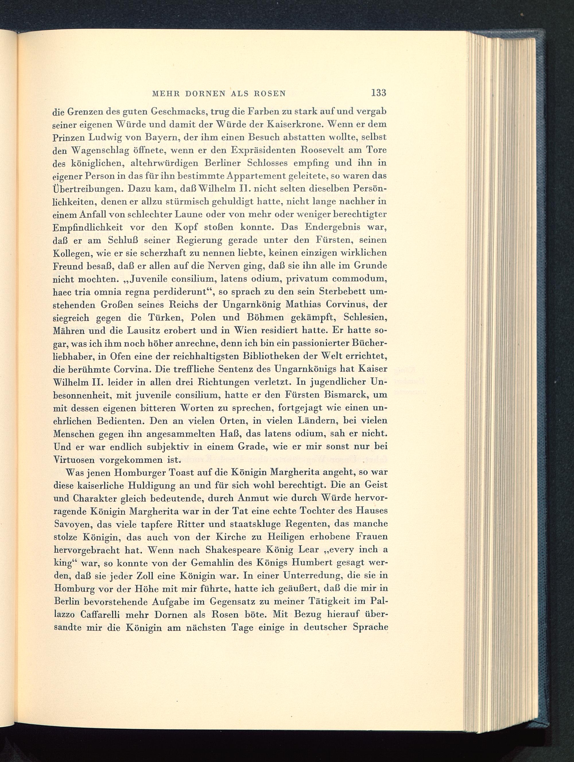 die Grenzen des guten Geschmacks, trug die Farben zu stark auf und vergabseiner eigenen Würde und damit der Würde der Kaiserkrone. Wenn er demPrinzen Ludwig von Bayern, der ihm einen Besuch abstatten wollte, selbstden Wagenschlag öffnete, wenn er den Expräsidenten Roosevelt am Toredes königlichen, altehrwürdigen Berliner Schlosses empfing und ihn ineigener Person in das für ihn bestimmte Appartement geleitete, so waren dasÜbertreibungen. Dazu kam, daß Wilhelm IL nicht selten dieselben Persön-lichkeiten, denen er allzu stürmisch gehuldigt hatte, nicht lange nachher ineinem Anfall von schlechter Laune oder von mehr oder weniger berechtigterEmpfindlichkeit vor den Kopf stoßen konnte. Das Endergebnis war,daß er am Schluß seiner Regierung gerade unter den Fürsten , seinenKollegen, wie er sie scherzhaft zu nennen liebte, keinen einzigen wirklichenFreund besaß, daß er allen auf die Nerven ging, daß sie ihn alle im Grundenicht mochten. „Juvenile consilium, latens odium, privatum commodum,haec tria omnia regna perdiderunt", so sprach zu den sein Sterbebett um-stehenden Großen seines Reichs der Ungarnkönig Mathias Corvinus , dersiegreich gegen die Türken, Polen und Böhmen gekämpft, Schlesien ,Mähren und die Lausitz erobert und in Wien residiert hatte. Er hatte so-gar, was ich ihm noch höher anrechne, denn ich bin ein passionierter Bücher-liebhaber, in Ofen eine der reichhaltigsten Bibliotheken der Welt errichtet,die berühmte Corvina. Die treffliche Sentenz des Ungarnkönigs hat KaiserWilhelm II. leider in allen drei Richtungen verletzt. In jugendlicher Un-besonnenheit, mit juvenile consilium, hatte er den Fürsten Bismarck , ummit dessen eigenen bitteren Worten zu sprechen, fortgejagt wie einen un-ehrlichen Bedienten. Den an vielen Orten, in vielen Ländern, bei vielenMenschen gegen ihn angesammelten Haß, das latens odium, sah er nicht.Und er war endlich subjektiv in einem Grade, wie er mir sonst nur beiVirtuosen vorgekommen ist.