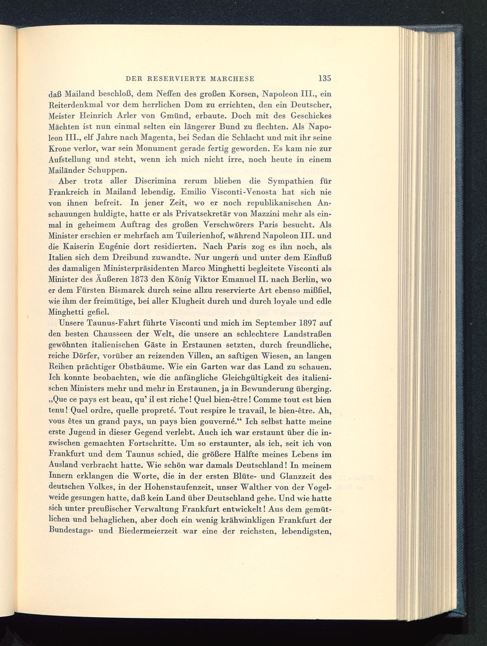 Unsere Taunus -Fahrt führte Visconti und mich im September 1897 aufden besten Chausseen der Welt, die unsere an schlechtere Landstraßengewöhnten italienischen Gäste in Erstaunen setzten, durch freundliche,reiche Dörfer, vorüber an reizenden Villen, an saftigen Wiesen, an langenReihen prächtiger Obstbäume. Wie ein Garten war das Land zu schauen.Ich konnte beobachten, wie die anfängliche Gleichgültigkeit des italieni-schen Ministers mehr und mehr in Erstaunen, ja in Bewunderung überging.„Que ce pays est beau, qu' il est riche! Quel bien-etre! Comme tout est bientenu! Quel ordre, quelle proprete. Tout respire le travail, le bien-etre. Ah,vous etes un grand pays, un pays bien gouverne." Ich selbst hatte meineerste Jugend in dieser Gegend verlebt. Auch ich war erstaunt über die in-zwischen gemachten Fortschritte. Um so erstaunter, als ich, seit ich vonFrankfurt und dem Taunus schied, die größere Hälfte meines Lebens imAusland verbracht hatte. Wie schön war damals Deutschland ! In meinemInnern erklangen die Worte, die in der ersten Blüte- und Glanzzeit desdeutschen Volkes, in der Hohenstaufenzeit, unser Walther von der Vogel-weide gesungen hatte, daß kein Land über Deutschland gehe. Und wie hattesich unter preußischer Verwaltung Frankfurt entwickelt! Aus dem gemüt-lichen und behaglichen, aber doch ein wenig krähwinkligen Frankfurt derBundestags- und Biedermeierzeit war eine der reichsten, lebendigsten,