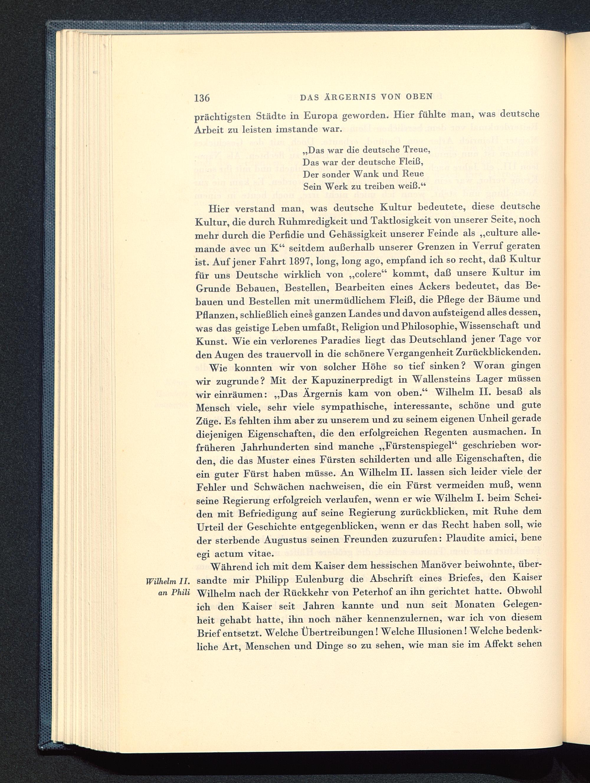 Wie konnten wir von solcher Höhe so tief sinken? Woran gingenwir zugrunde? Mit der Kapuzinerpredigt in Wallensteins Lager müssenwir einräumen: „Das Ärgernis kam von oben." Wilhelm II. besaß alsMensch viele, sehr viele sympathische, interessante, schöne und guteZüge. Es fehlten ihm aber zu unserem und zu seinem eigenen Unheil geradediejenigen Eigenschaften, die den erfolgreichen Regenten ausmachen. Infrüheren Jahrhunderten sind manche „Fürstenspiegel " geschrieben wor-den, die das Muster eines Fürsten schilderten und alle Eigenschaften, dieein guter Fürst haben müsse. An Wilhelm II. lassen sich leider viele derFehler und Schwächen nachweisen, die ein Fürst vermeiden muß, wennseine Regierung erfolgreich verlaufen, wenn er wie Wilhelm I. beim Schei-den mit Befriedigung auf seine Regierung zurückblicken, mit Ruhe demUrteil der Geschichte entgegenblicken, wenn er das Recht haben soll, wieder sterbende Augustus seinen Freunden zuzurufen: Plaudite amici, beneegi actum vitae.