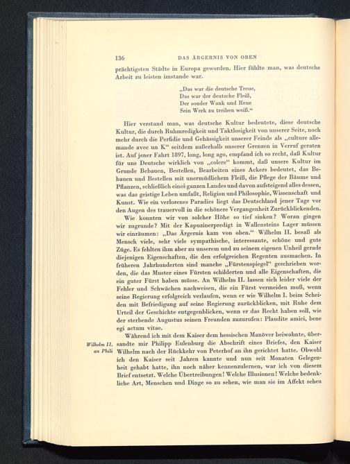 Während ich mit dem Kaiser dem hessischen Manöver beiwohnte, über-Wilhelm II. sandte mir Philipp Eulenburg die Abschrift eines Briefes, den Kaiseran Phili Wilhelm nach der Rückkehr von Peterhof an ihn gerichtet hatte. Obwohlich den Kaiser seit Jahren kannte und nun seit Monaten Gelegen-heit gehabt hatte, ihn noch näher kennenzulernen, war ich von diesemBrief entsetzt. Welche Übertreibungen! Welche Illusionen! Welche bedenk-liche Art, Menschen und Dinge so zu sehen, wie man sie im Affekt sehen