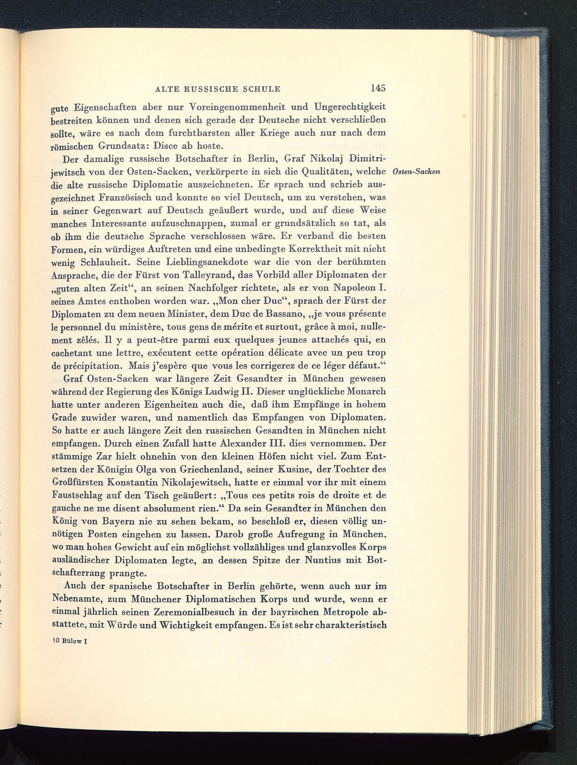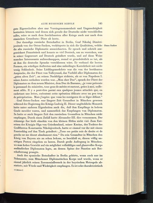 Der damalige russische Botschafter in Berlin , Graf Nikolaj Dimitri-jewitsch von der Osten-Sacken, verkörperte in sich die Qualitäten, welche Osten-Sackendie alte russische Diplomatie auszeichneten. Er sprach und schrieb aus-gezeichnet Französisch und konnte so viel Deutsch, um zu verstehen, wasin seiner Gegenwart auf Deutsch geäußert wurde, und auf diese Weisemanches Interessante aufzuschnappen, zumal er grundsätzlich so tat, alsob ihm die deutsche Sprache verschlossen wäre. Er verband die bestenFormen, ein würdiges Auftreten und eine unbedingte Korrektheit mit nichtwenig Schlauheit. Seine Lieblingsanekdote war die von der berühmtenAnsprache, die der Fürst von Talleyrand, das Vorbild aller Diplomaten der„guten alten Zeit", an seinen Nachfolger richtete, als er von Napoleon I. seines Amtes enthoben worden war. „Mon eher Duc", sprach der Fürst derDiplomaten zu dem neuen Minister, dem Duc de Bassano , „je vous presentele personnel du ministere, tous gens de merite et surtout, gräce ä moi, nulle-ment zeles. II y a peut-etre parmi eux quelques jeunes attaches qui, encachetant une lettre, executent cette Operation delicate avec un peu tropde preeipitation. Mais j'espere que vous les corrigerez de ce leger defaut."