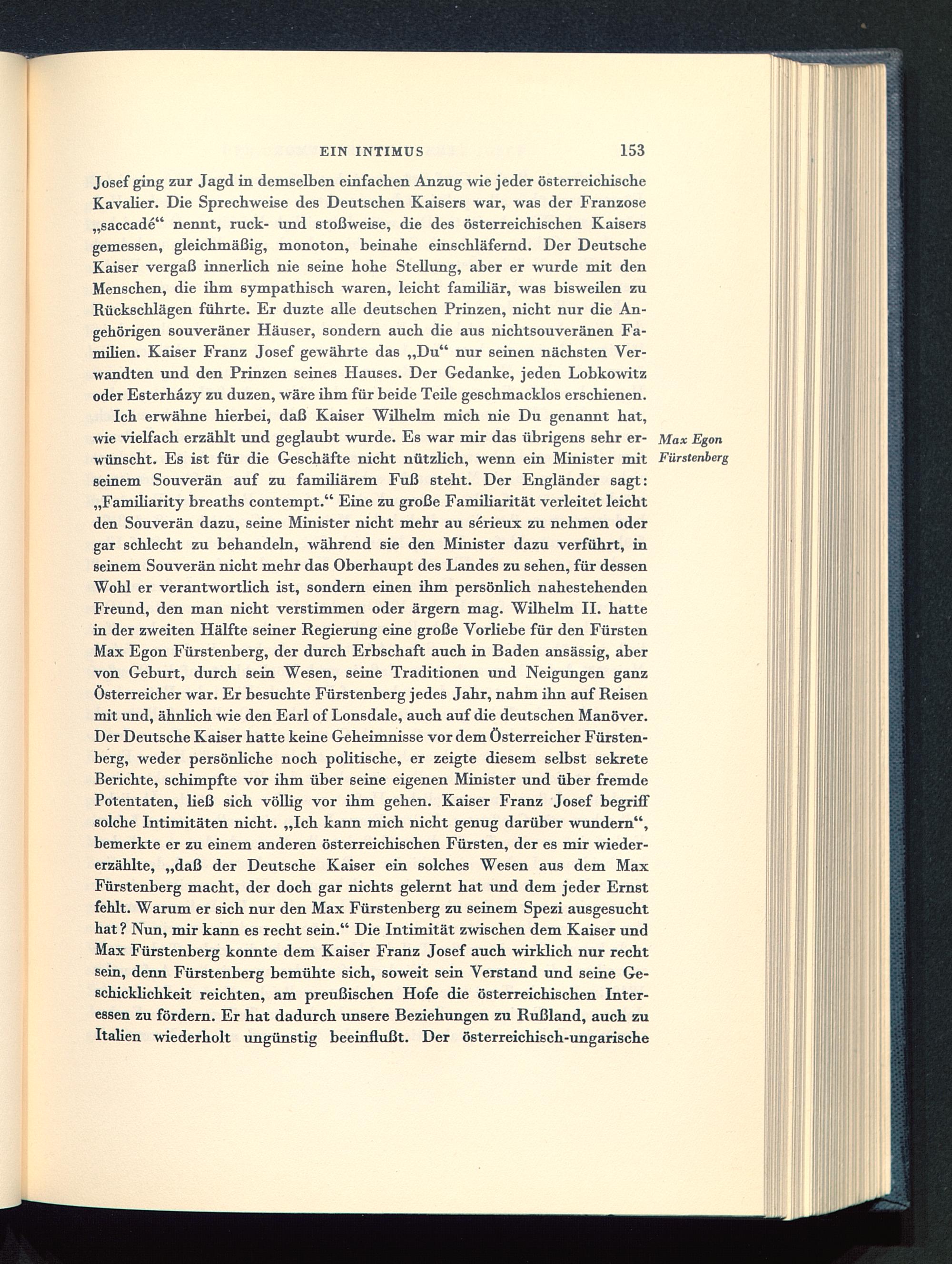 Ich erwähne hierbei, daß Kaiser Wilhelm mich nie Du genannt hat,wie vielfach erzählt und geglaubt wurde. Es war mir das übrigens sehr er- Max Egon wünscht. Es ist für die Geschäfte nicht nützlich, wenn ein Minister mit Fürstenbergseinem Souverän auf zu familiärem Fuß steht. Der Engländer sagt:„Familiarity breaths contempt." Eine zu große Familiarität verleitet leichtden Souverän dazu, seine Minister nicht mehr au serieux zu nehmen odergar schlecht zu behandeln, während sie den Minister dazu verführt, inseinem Souverän nicht mehr das Oberhaupt des Landes zu sehen, für dessenWohl er verantwortlich ist, sondern einen ihm persönlich nahestehendenFreund, den man nicht verstimmen oder ärgern mag. Wilhelm II. hattein der zweiten Hälfte seiner Regierung eine große Vorliebe für den Fürsten Max Egon Fürstenberg , der durch Erbschaft auch in Baden ansässig, abervon Geburt, durch sein Wesen, seine Traditionen und Neigungen ganzÖsterreicher war. Er besuchte Fürstenberg jedes Jahr, nahm ihn auf Reisenmit und, ähnlich wie den Earl of Lonsdale, auch auf die deutschen Manöver.Der Deutsche Kaiser hatte keine Geheimnisse vor dem Österreicher Fürsten-berg, weder persönliche noch politische, er zeigte diesem selbst SekreteBerichte, schimpfte vor ihm über seine eigenen Minister und über fremdePotentaten, Heß sich völlig vor ihm gehen. Kaiser Franz Josef begriffsolche Intimitäten nicht. „Ich kann mich nicht genug darüber wundern",bemerkte er zu einem anderen österreichischen Fürsten , der es mir wieder-erzählte, „daß der Deutsche Kaiser ein solches Wesen aus dem MaxFürstenberg macht, der doch gar nichts gelernt hat und dem jeder Ernstfehlt. Warum er sich nur den Max Fürstenberg zu seinem Spezi ausgesuchthat ? Nun, mir kann es recht sein." Die Intimität zwischen dem Kaiser undMax Fürstenberg konnte dem Kaiser Franz Josef auch wirklich nur rechtsein, denn Fürstenberg bemühte sich, soweit sein Verstand und seine Ge-schicklichkeit reichten, am preußischen Hofe die österreichischen Inter-essen zu fördern. Er hat dadurch unsere Beziehungen zu Rußland , auch zuItalien wiederholt ungünstig beeinflußt. Der österreichisch-ungarische