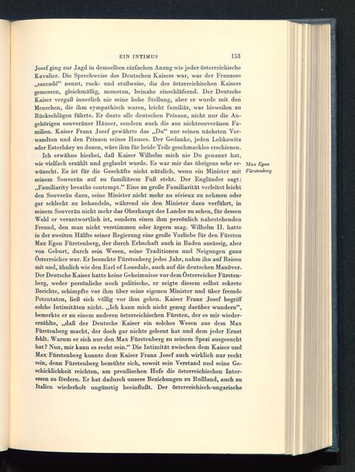 Josef ging zur Jagd in demselben einfachen Anzug wie jeder österreichischeKavalier. Die Sprechweise des Deutschen Kaisers war, was der Franzose„saccade" nennt, ruck- und stoßweise, die des österreichischen Kaisersgemessen, gleichmäßig, monoton, beinahe einschläfernd. Der DeutscheKaiser vergaß innerlich nie seine hohe Stellung, aber er wurde mit denMenschen, die ihm sympathisch waren, leicht familiär, was bisweilen zuRückschlägen führte. Er duzte alle deutschen Prinzen, nicht nur die An-gehörigen souveräner Häuser, sondern auch die aus nichtsouveränen Fa-milien. Kaiser Franz Josef gewährte das „Du" nur seinen nächsten Ver-wandten und den Prinzen seines Hauses. Der Gedanke, jeden Lobkowitzoder Esterhäzy zu duzen, wäre ihm für beide Teile geschmacklos erschienen.