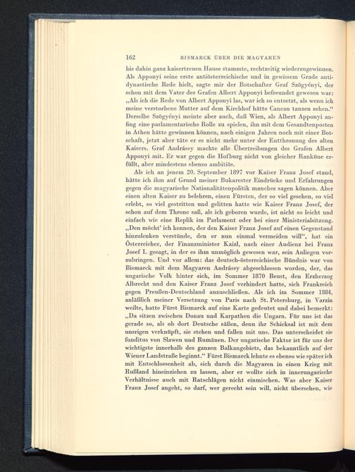 Als ich an jenem 20. September 1897 vor Kaiser Franz Josef stand,hätte ich ihm auf Grund meiner Bukarester Eindrücke und Erfahrungengegen die magyarische Nationalitätenpolitik manches sagen können. Abereinen alten Kaiser zu belehren, einen Fürsten , der so viel gesehen, so vielerlebt, so viel gestritten und gelitten hatte wie Kaiser Franz Josef , derschon auf dem Throne saß, als ich geboren wurde, ist nicht so leicht undeinfach wie eine Replik im Parlament oder bei einer Ministerialsitzung.„Den möcht' ich kennen, der den Kaiser Franz Josef auf einen Gegenstandhinzulenken verstünde, den er nun einmal vermeiden will", hat einÖsterreicher, der Finanzminister Kaizl, nach einer Audienz bei FranzJosef I. gesagt, in der es ihm unmöglich gewesen war, sein Anliegen vor-zubringen. Und vor allem: das deutsch -österreichische Bündnis war vonBismarck mit dem Magyaren Andrässy abgeschlossen worden, der, dasungarische Volk hinter sich, im Sommer 1870 Beust, den ErzherzogAlbrecht und den Kaiser Franz Josef verhindert hatte, sich Frankreich gegen Preußen-Deutschland anzuschließen. Als ich im Sommer 1884,anläßlich meiner Versetzung von Paris nach St. Petersburg, in Varzin weilte, hatte Fürst Bismarck auf eine Karte gedeutet und dabei bemerkt:„Da sitzen zwischen Donau und Karpathen die Ungarn . Für uns ist dasgerade so, als ob dort Deutsche säßen, denn ihr Schicksal ist mit demunsrigen verknüpft, sie stehen und fallen mit uns. Das unterscheidet siefunditus von Slawen und Rumänen. Der ungarische Faktor ist für uns derwichtigste innerhalb des ganzen Balkangebiets, das bekanntlich auf derWiener Landstraße beginnt." Fürst Bismarck lehnte es ebenso wie später ichmit Entschlossenheit ab, sich durch die Magyaren in einen Krieg mitRußland hineinziehen zu lassen, aber er wollte sich in innerungarischeVerhältnisse auch mit Ratschlägen nicht einmischen. Was aber KaiserFranz Josef angeht, so darf, wer gerecht sein will, nicht übersehen, wie