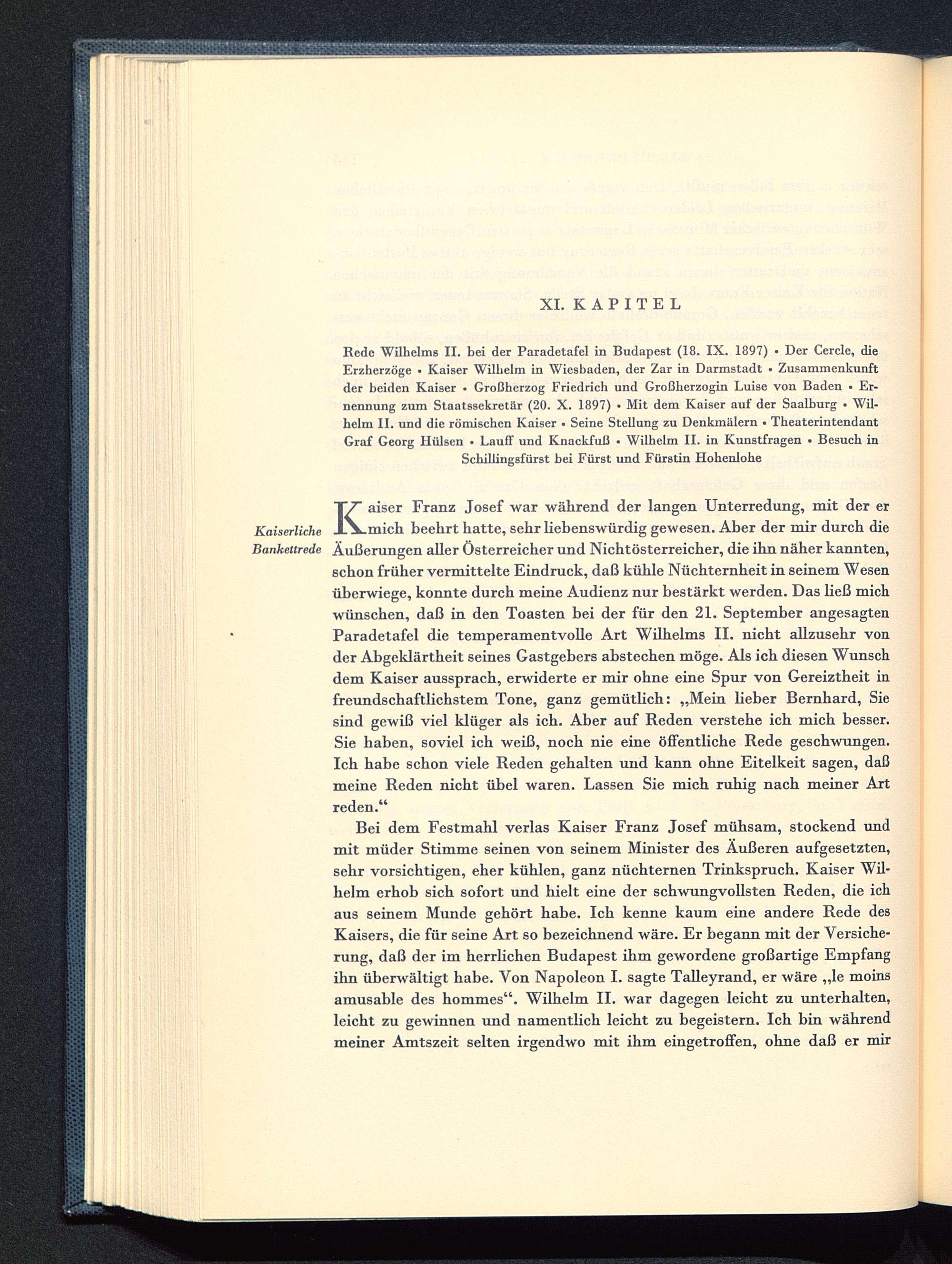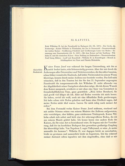 Rede Wilhelms II. bei der Paradetafel in Budapest (18. IX. 1897) • Der Cercle, dieErzherzöge • Kaiser Wilhelm in Wiesbaden, der Zar in Darmstadt • Zusammenkunftder beiden Kaiser • Großherzog Friedricli und Großherzogin Luise von Baden • Er-nennung zum Staatssekretär (20. X. 1897) ■ Mit dem Kaiser auf der Saalburg • Wil-helm II. und die römischen Kaiser • Seine Stellung zu Denkmälern • TheaterintendantGraf Georg Hülsen • Lauff und Knackfuß • Wilhelm II. in Kunstfragen • Besuch inSchillingsfürst bei Fürst und Fürstin Hohenlohe