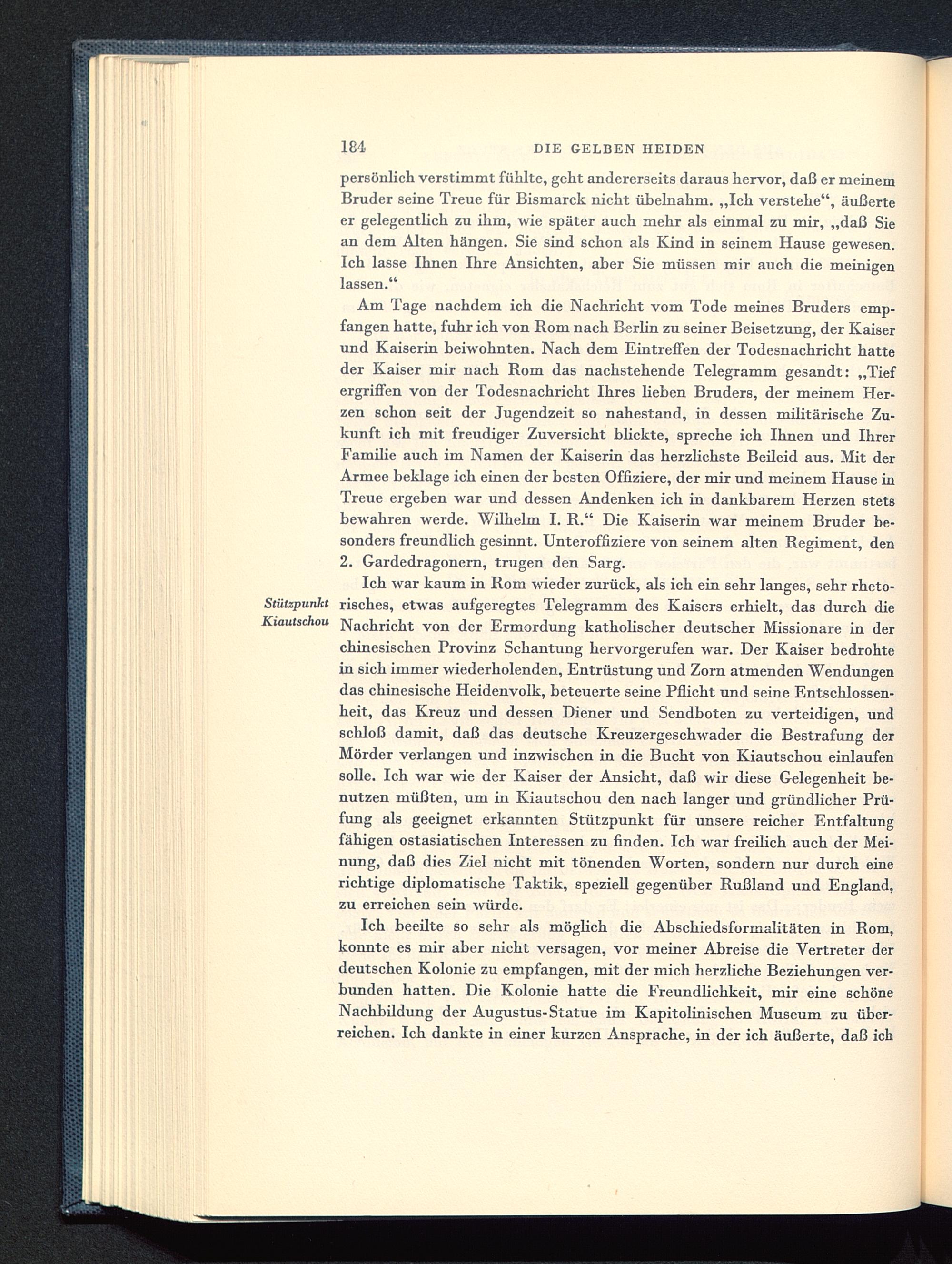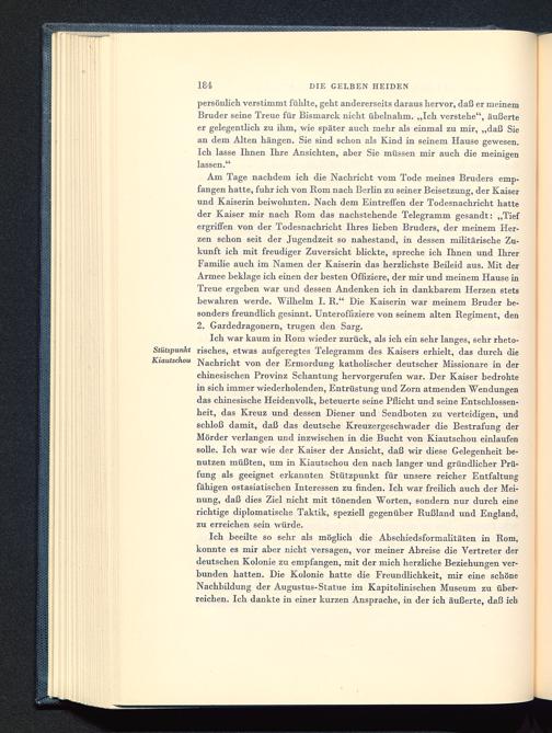 Ich war kaum in Rom wieder zurück, als ich ein sehr langes, sehr rheto-Stützpunkt risches, etwas aufgeregtes Telegramm des Kaisers erhielt, das durch dieKiautschou Nachricht von der Ermordung katholischer deutscher Missionare in derchinesischen Provinz Schantung hervorgerufen war. Der Kaiser bedrohtein sich immer wiederholenden, Entrüstung und Zorn atmenden Wendungendas chinesische Heidenvolk, beteuerte seine Pflicht und seine Entschlossen-heit, das Kreuz und dessen Diener und Sendboten zu verteidigen, undschloß damit, daß das deutsche Kreuzergeschwader die Bestrafung derMörder verlangen und inzwischen in die Bucht von Kiautschou einlaufensolle. Ich war wie der Kaiser der Ansicht, daß wir diese Gelegenheit be-nutzen müßten, um in Kiautschou den nach langer und gründlicher Prü-fung als geeignet erkannten Stützpunkt für unsere reicher Entfaltungfähigen ostasiatischen Interessen zu finden. Ich war freilich auch der Mei-nung, daß dies Ziel nicht mit tönenden Worten, sondern nur durch einerichtige diplomatische Taktik, speziell gegenüber Rußland und England ,zu erreichen sein würde.