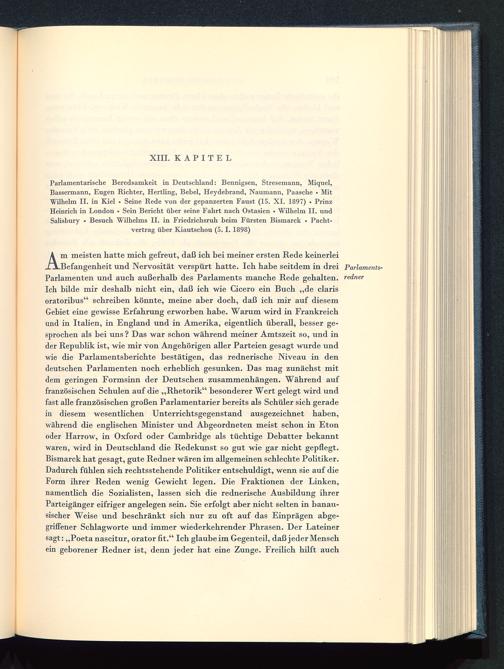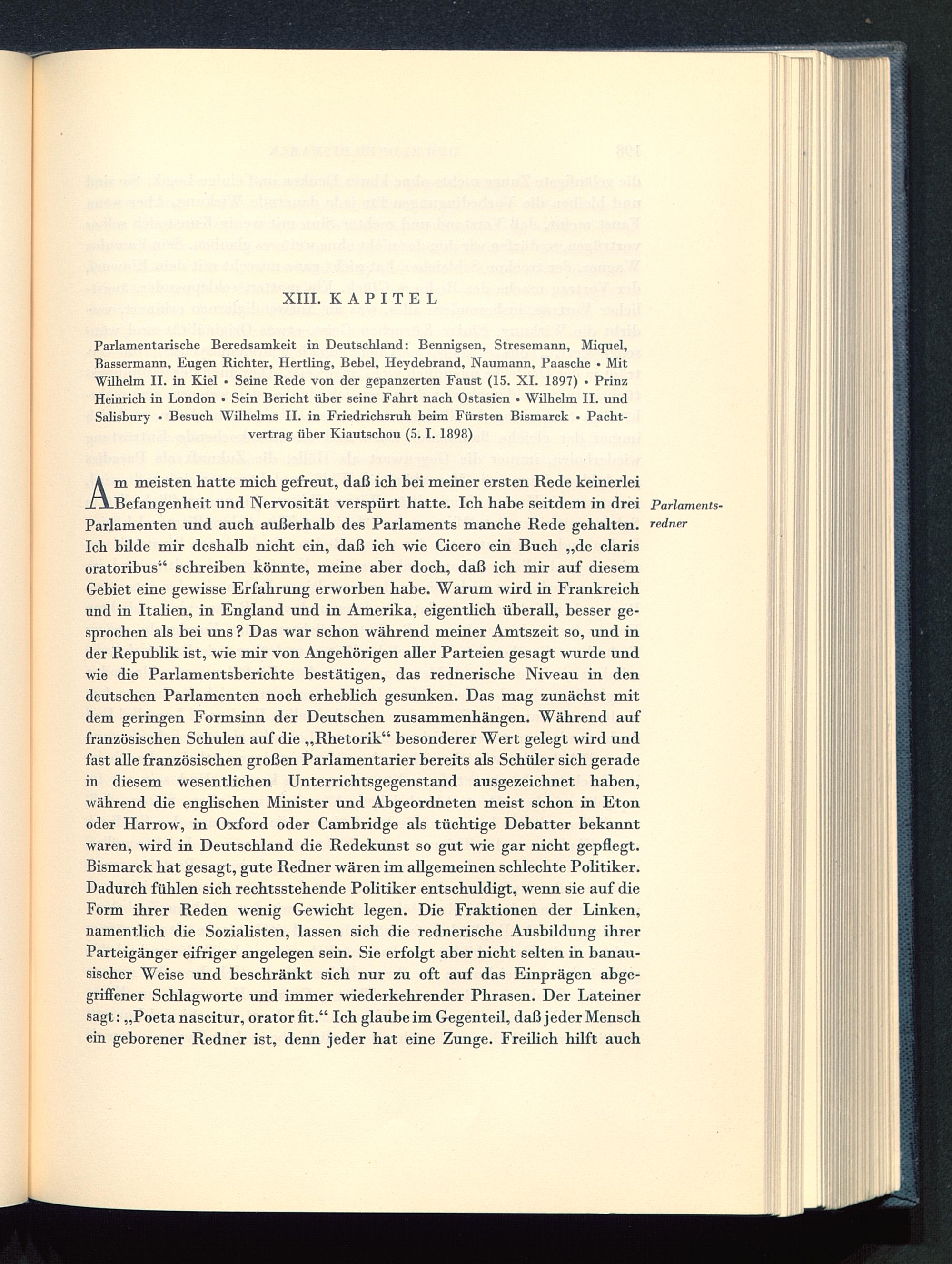 Parlamentarische Beredsamkeit in Deutschland : Bennigsen, Stresemann, Miquel,Bassermann, Eugen Richter , Hertling, Bebel, Heydebrand, Naumann, Paasche • MitWilhelm II. in Kiel • Seine Rede von der gepanzerten Faust (15. XI. 1897) • PrinzHeinrich in London • Sein Bericht über seine Fahrt nach Ostasien • Wilhelm II. undSalisbury • Besuch Wilhelms II. in Friedrichsruh beim Fürsten Bismarck • Pacht-vertrag über Kiautschou (5. I. 1898)