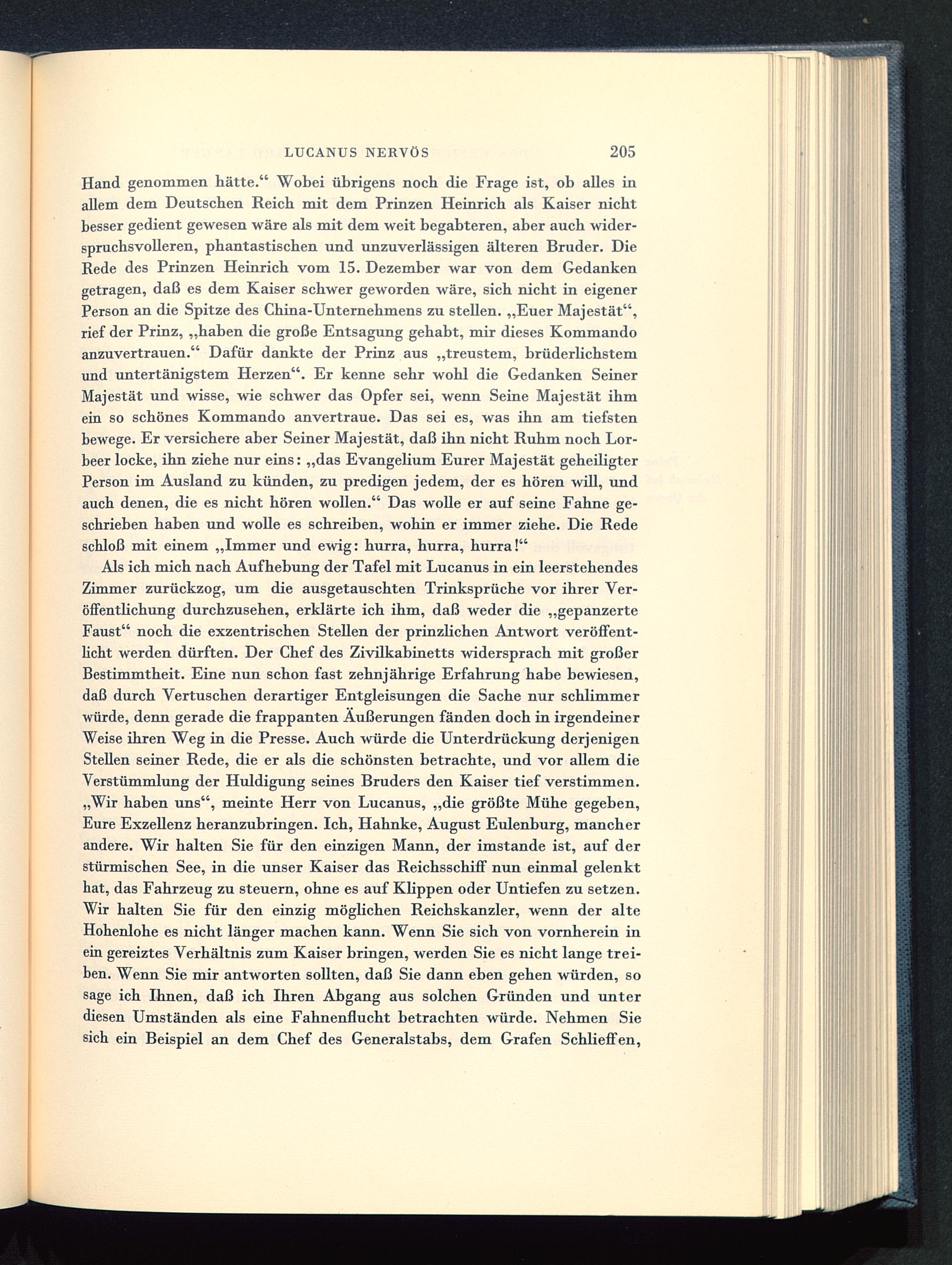 Hand genommen hätte." Wobei übrigens noch die Frage ist, ob alles inallem dem Deutschen Reich mit dem Prinzen Heinrich als Kaiser nichtbesser gedient gewesen wäre als mit dem weit begabteren, aber auch wider-spruchsvolleren, phantastischen und unzuverlässigen älteren Bruder. DieRede des Prinzen Heinrich vom 15. Dezember war von dem Gedankengetragen, daß es dem Kaiser schwer geworden wäre, sich nicht in eigenerPerson an die Spitze des China-Unternehmens zu stellen. „Euer Majestät",rief der Prinz, „haben die große Entsagung gehabt, mir dieses Kommandoanzuvertrauen." Dafür dankte der Prinz aus „treustem, brüderlichstemund untertänigstem Herzen". Er kenne sehr wohl die Gedanken SeinerMajestät und wisse, wie schwer das Opfer sei, wenn Seine Majestät ihmein so schönes Kommando anvertraue. Das sei es, was ihn am tiefstenbewege. Er versichere aber Seiner Majestät, daß ihn nicht Ruhm noch Lor-beer locke, ihn ziehe nur eins: „das Evangelium Eurer Majestät geheiligterPerson im Ausland zu künden, zu predigen jedem, der es hören will, undauch denen, die es nicht hören wollen." Das wolle er auf seine Fahne ge-schrieben haben und wolle es schreiben, wohin er immer ziehe. Die Redeschloß mit einem „Immer und ewig: hurra, hurra, hurra!"