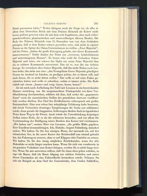 Als ich mich nach Aufhebung der Tafel mit Lucanus in ein leerstehendesZimmer zurückzog, um die ausgetauschten Trinksprüche vor ihrer Ver-öffentlichung durchzusehen, erklärte ich ihm, daß weder die „gepanzerteFaust" noch die exzentrischen Stellen der prinzHchen Antwort veröffent-licht werden dürften. Der Chef des Zivilkabinetts widersprach mit großerBestimmtheit. Eine nun schon fast zehnjährige Erfahrung habe bewiesen,daß durch Vertuschen derartiger Entgleisungen die Sache nur schlimmerwürde, denn gerade die frappanten Äußerungen fänden doch in irgendeinerWeise ihren Weg in die Presse. Auch würde die Unterdrückung derjenigenStellen seiner Rede, die er als die schönsten betrachte, und vor allem dieVerstümmlung der Huldigung seines Bruders den Kaiser tief verstimmen.„Wir haben uns", meinte Herr von Lucanus, „die größte Mühe gegeben,Eure Exzellenz heranzubringen. Ich, Hahnke, August Eulenburg, mancherandere. Wir halten Sie für den einzigen Mann, der imstande ist, auf derstürmischen See, in die unser Kaiser das Reichsschiff nun einmal gelenkthat, das Fahrzeug zu steuern, ohne es auf Klippen oder Untiefen zu setzen.Wir halten Sie für den einzig möglichen Reichskanzler, wenn der alteHohenlohe es nicht länger machen kann. Wenn Sie sich von vornherein inein gereiztes Verhältnis zum Kaiser bringen, werden Sie es nicht lange trei-ben. Wenn Sie mir antworten sollten, daß Sie dann eben gehen würden, sosage ich Ihnen, daß ich Ihren Abgang aus solchen Gründen und unterdiesen Umständen als eine Fahnenflucht betrachten würde. Nehmen Siesich ein Beispiel an dem Chef des Generalstabs, dem Grafen Schlieffen ,