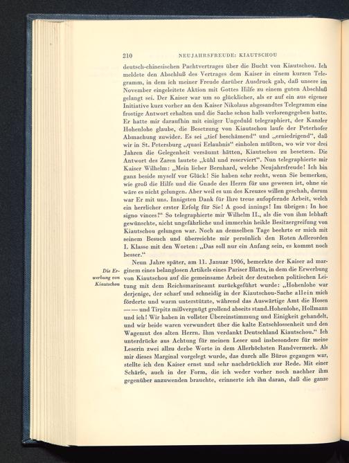 Neun Jahre später, am 11. Januar 1906, bemerkte der Kaiser ad mar-Die Er- ginem eines belanglosen Artikels eines Pariser Blatts, in dem die ErwerbungWerbung von von Kiautschou auf die gemeinsame Arbeit der deutschen poUtischen Lei-Kiautschou t un g m jt dem Reichsmarineamt zurückgeführt wurde: „Hohenlohe warderjenige, der scharf und schneidig in der Kiautschou-Sache allein michförderte und warm unterstützte, während das Auswärtige Amt die Hosen