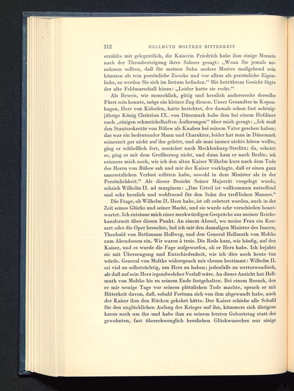 Die Frage, ob Wilhelm II. Herz habe, ist oft erörtert worden, auch in derZeit seines Glücks und seiner Macht, und sie wurde sehr verschieden beant-wortet. Ich entsinne mich eines merkwürdigen Gesprächs aus meiner Beichs-kanzlerzeit über diesen Punkt. An einem Abend, wo meine Frau ein Kon-zert oder die Oper besuchte, lud ich mir den damaligen Minister des Innern,Theobald von Bethmann Hollweg, und den General Hellmuth von Moltkezum Abendessen ein. Wir waren ä trois. Die Bede kam, wie häufig, auf denKaiser, und es wurde die Fage aufgeworfen, ob er Herz habe. Ich bejahtesie mit Überzeugung und Entschiedenheit, wie ich dies noch heute tunwürde. General von Moltke widersprach mir ebenso bestimmt: Wilhelm II. sei viel zu selbstsüchtig, um Herz zu haben; jedenfalls zu wetterwendisch,als daß auf sein Herz irgendwelcher Verlaß wäre. An dieser Ansicht hat Hell-muth von Moltke bis zu seinem Ende festgehalten. Bei einem Besuch, dener mir wenige Tage vor seinem plötzlichen Tode machte, sprach er mitBitterkeit davon, daß, sobald Fortuna sich von ihm abgewandt habe, auchder Kaiser ihm den Bücken gekehrt hätte. Der Kaiser schiebe alle Schuldfür den unglücklichen Anfang des Krieges auf ihn, kümmere sich übrigenskaum noch um ihn und habe ihm zu seinem letzten Geburtstag statt desgewohnten, fast überschwenglich herzHchen Glückwunsches nur einige