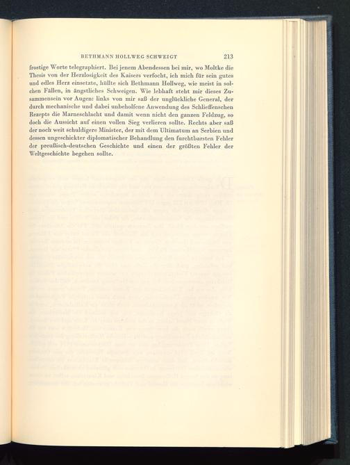 frostige Worte telegraphiert. Bei jenem Abendessen bei mir, wo Moltke dieThesis von der Herzlosigkeit des Kaisers verfocht, ich mich für sein gutesund edles Herz einsetzte, hüllte sich Bethmann Hollweg, wie meist in sol-chen Fällen, in ängstliches Schweigen. Wie lebhaft steht mir dieses Zu-sammensein vor Augen: links von mir saß der unglückliche General, derdurch mechanische und dabei unbeholfene Anwendung des SchlieffenschenRezepts die Marneschlacht und damit wenn nicht den ganzen Feldzug, sodoch die Aussicht auf einen vollen Sieg verlieren sollte. Rechts aber saßder noch weit schuldigere Minister, der mit dem Ultimatum an Serbien unddessen ungeschickter diplomatischer Behandlung den furchtbarsten Fehlerder preußisch-deutschen Geschichte und einen der größten Fehler derWeltgeschichte begehen sollte.
