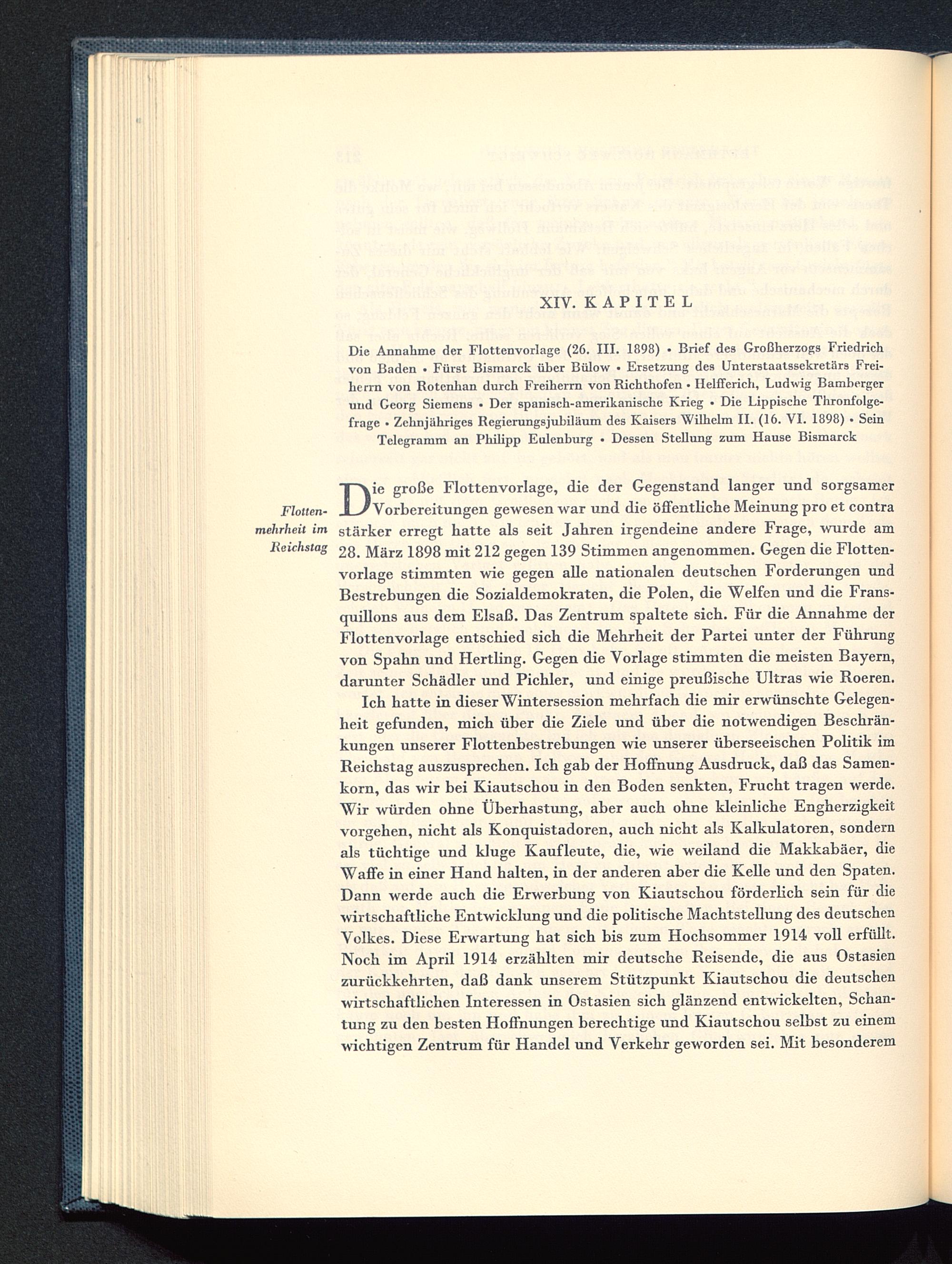 Die Annahme der Flottenvorlage (26. III. 1898) • Brief des Großherzogs Friedrichvon Baden • Fürst Bismarck über Bülow • Ersetzung des Unterstaatssekretürs Frei-herrn von Rotcnhan durch Freiherrn von Richthofen • Helfferich, Ludwig Bambergcrund Ceorg Siemens • Der spanisch-amerikanische Krieg • Die Lippische Thronfolgc-frage • Zehnjähriges Regierungsjubiläum des Kaisers Wilhelm II. (16. VI. 1898) • SeinTelegramm an Philipp Eulenburg • Dessen Stellung zum Hause Bismarck