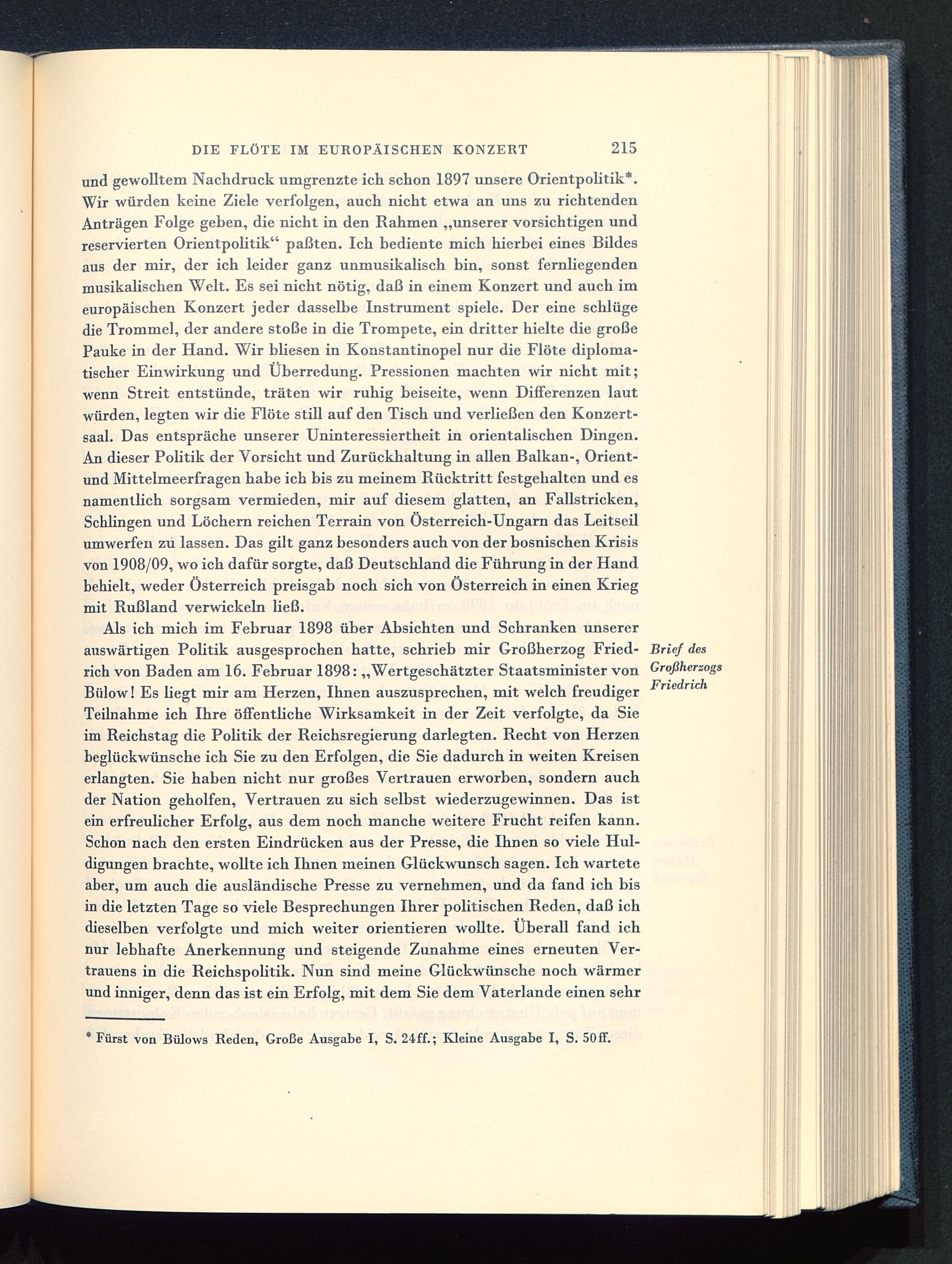 und gewolltem Nachdruck umgrenzte ich schon 1897 unsere Orientpolitik*.Wir würden keine Ziele verfolgen, auch nicht etwa an uns zu richtendenAnträgen Folge geben, die nicht in den Rahmen „unserer vorsichtigen undreservierten Orientpolitik" paßten. Ich bediente mich hierbei eines Bildesaus der mir, der ich leider ganz unmusikalisch bin, sonst fernliegendenmusikalischen Welt. Es sei nicht nötig, daß in einem Konzert und auch imeuropäischen Konzert jeder dasselbe Instrument spiele. Der eine schlügedie Trommel, der andere stoße in die Trompete, ein dritter hielte die großePauke in der Hand. Wir Wiesen in Konstantinopel nur die Flöte diploma-tischer Einwirkung und Überredung. Pressionen machten wir nicht mit;wenn Streit entstünde, träten wir ruhig beiseite, wenn Differenzen lautwürden, legten wir die Flöte still auf den Tisch und verließen den Konzert-saal. Das entspräche unserer Uninteressiertheit in orientalischen Dingen.An dieser Politik der Vorsicht und Zurückhaltung in allen Balkan -, Orient-und Mittelmeerfragen habe ich bis zu meinem Rücktritt festgehalten und esnamentlich sorgsam vermieden, mir auf diesem glatten, an Fallstricken,Schlingen und Löchern reichen Terrain von Österreich-Ungarn das Leitseilumwerfen zu lassen. Das gilt ganz besonders auch von der bosnischen Krisisvon 1908/09, wo ich dafür sorgte, daß Deutschland die Führung in der Handbehielt, weder Österreich preisgab noch sich von Österreich in einen Kriegmit Rußland verwickeln ließ.