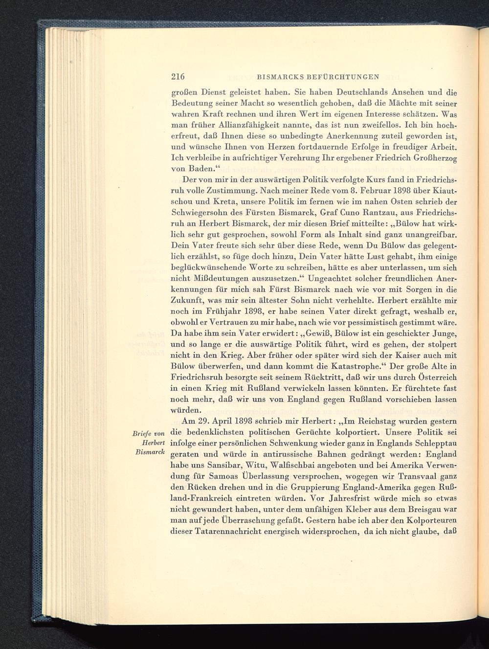 Der von mir in der auswärtigen Politik verfolgte Kurs fand in Friedrichs-ruh volle Zustimmung. Nach meiner Rede vom 8. Februar 1898 über Kiaut-schou und Kreta , unsere Politik im fernen wie im nahen Osten schrieb derSchwiegersohn des Fürsten Bismarck, Graf Cuno Rantzau, aus Friedrichs-ruh an Herbert Bismarck , der mir diesen Brief mitteilte: „Bülow hat wirk-lich sehr gut gesprochen, sowohl Form als Inhalt sind ganz unangreifbar.Dein Vater freute sich sehr über diese Rede, wenn Du Bülow das gelegent-lich erzählst, so füge doch hinzu, Dein Vater hätte Lust gehabt, ihm einigebeglückwünschende Worte zu schreiben, hätte es aber unterlassen, um sichnicht Mißdeutungen auszusetzen." Ungeachtet solcher freundlichen Aner-kennungen für mich sah Fürst Bismarck nach wie vor mit Sorgen in dieZukunft, was mir sein ältester Sohn nicht verhehlte. Herbert erzählte mirnoch im Frühjahr 1898, er habe seinen Vater direkt gefragt, weshalb er,obwohl er Vertrauen zu mir habe, nach wie vor pessimistisch gestimmt wäre.Da habe ihm sein Vater erwidert: „Gewiß, Bülow ist ein geschickter Junge,und so lange er die auswärtige Politik führt, wird es gehen, der stolpertnicht in den Krieg. Aber früher oder später wird sich der Kaiser auch mitBülow überwerfen, und dann kommt die Katastrophe." Der große Alte inFriedrichsruh besorgte seit seinem Rücktritt, daß wir uns durch Österreich in einen Krieg mit Rußland verwickeln lassen könnten. Er fürchtete fastnoch mehr, daß wir uns von England gegen Rußland vorschieben lassenwürden.
