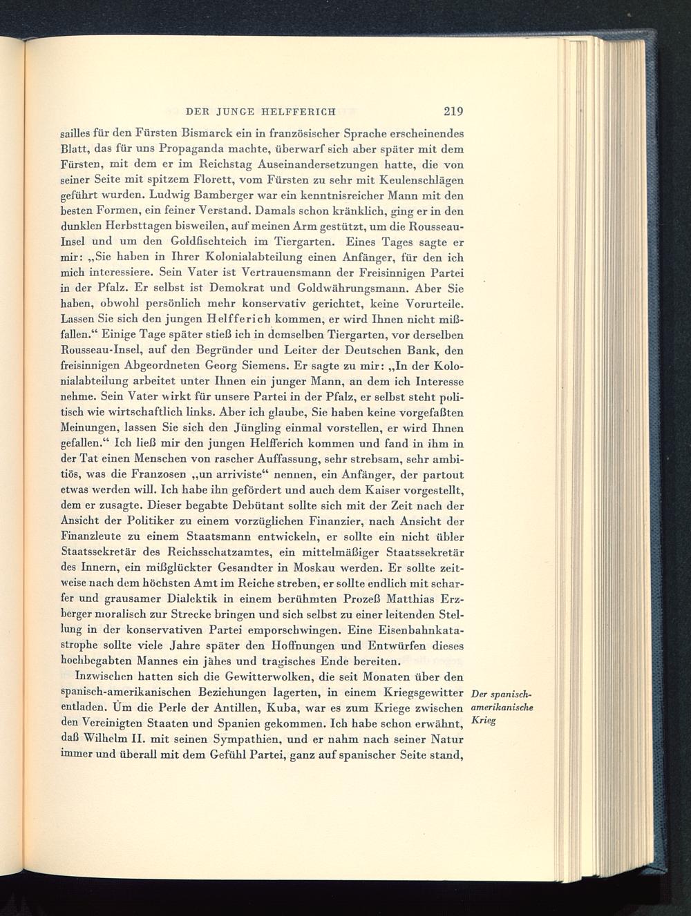 sailles für den Fürsten Bismarck ein in französischer Sprache erscheinendesBlatt, das für uns Propaganda machte, überwarf sich aber später mit demFürsten, mit dem er im Reichstag Auseinandersetzungen hatte, die vonseiner Seite mit spitzem Florett, vom Fürsten zu sehr mit Keulenschlägengeführt wurden. Ludwig Bamberger war ein kenntnisreicher Mann mit denbesten Formen, ein feiner Verstand. Damals schon kränklich, ging er in dendunklen Herbsttagen bisweilen, auf meinen Arm gestützt, um die Rousseau-Insel und um den Goldfischteich im Tiergarten. Eines Tages sagte ermir: „Sie haben in Ihrer Kolonialabteilung einen Anfänger, für den ichmich interessiere. Sein Vater ist Vertrauensmann der Freisinnigen Parteiin der Pfalz. Er selbst ist Demokrat und Goldwährungsmann. Aber Siehaben, obwohl persönlich mehr konservativ gerichtet, keine Vorurteile.Lassen Sie sich den jungen Helfferich kommen, er wird Ihnen nicht miß-fallen." Einige Tage später stieß ich in demselben Tiergarten, vor derselbenRousseau-Insel, auf den Begründer und Leiter der Deutschen Bank, denfreisinnigen Abgeordneten Georg Siemens . Er sagte zu mir: „In der Kolo-nialabteilung arbeitet unter Ihnen ein junger Mann, an dem ich Interessenehme. Sein Vater wirkt für unsere Partei in der Pfalz, er selbst steht poli-tisch wie wirtschaftlich links. Aber ich glaube, Sie haben keine vorgefaßtenMeinungen, lassen Sie sich den Jüngling einmal vorstellen, er wird Ihnengefallen." Ich ließ mir den jungen Helflerich kommen und fand in ihm inder Tat einen Menschen von rascher Auffassung, sehr strebsam, sehr ambi-tiös, was die Franzosen ,,un arriviste" nennen, ein Anfänger, der partoutetwas werden will. Ich habe ihn gefördert und auch dem Kaiser vorgestellt,dem er zusagte. Dieser begabte Debütant sollte sich mit der Zeit nach derAnsicht der Politiker zu einem vorzüglichen Finanzier, nach Ansicht derFinanzleute zu einem Staatsmann entwickeln, er sollte ein nicht üblerStaatssekretär des Reichsschatzamtes, ein mittelmäßiger Staatssekretärdes Innern, ein mißglückter Gesandter in Moskau werden. Er sollte zeit-weise nach dem höchsten Amt im Reiche streben, er sollte endlich mit schar-fer und grausamer Dialektik in einem berühmten Prozeß Matthias Erz-berger moralisch zur Strecke bringen und sich selbst zu einer leitenden Stel-lung in der konservativen Partei emporschwingen. Eine Eisenbahnkata-strophe sollte viele Jahre später den Hoffnungen und Entwürfen dieseshochbegabten Mannes ein jähes und tragisches Ende bereiten.
