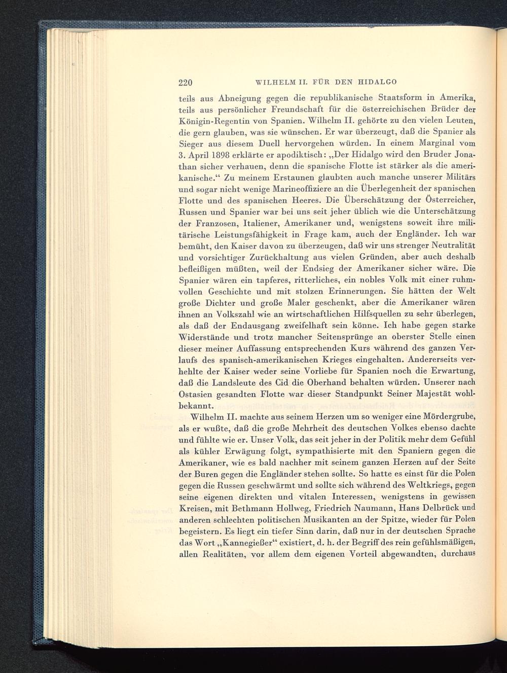 Wilhelm II. machte aus seinem Herzen um so weniger eine Mördergrube,als er wußte, daß die große Mehrheit des deutschen Volkes ebenso dachteund fühlte wie er. Unser Volk, das seit jeher in der Politik mehr dem Gefühlals kühler Erwägung folgt, sympathisierte mit den Spaniern gegen dieAmerikaner, wie es bald nachher mit seinem ganzen Herzen auf der Seiteder Buren gegen die Engländer stehen sollte. So hatte es einst für die Polen gegen die Russen geschwärmt und sollte sich während des Weltkriegs, gegenseine eigenen direkten und vitalen Interessen, wenigstens in gewissenKreisen, mit Bethmann Hollweg, Friedrich Naumann, Hans Delbrück undanderen schlechten politischen Musikanten an der Spitze, wieder für Polen begeistern. Es liegt ein tiefer Sinn darin, daß nur in der deutschen Sprachedas Wort „Kannegießer" existiert, d. h. der Begriff des rein gefühlsmäßigen,allen Realitäten, vor allem dem eigenen Vorteil abgewandten, durchaus