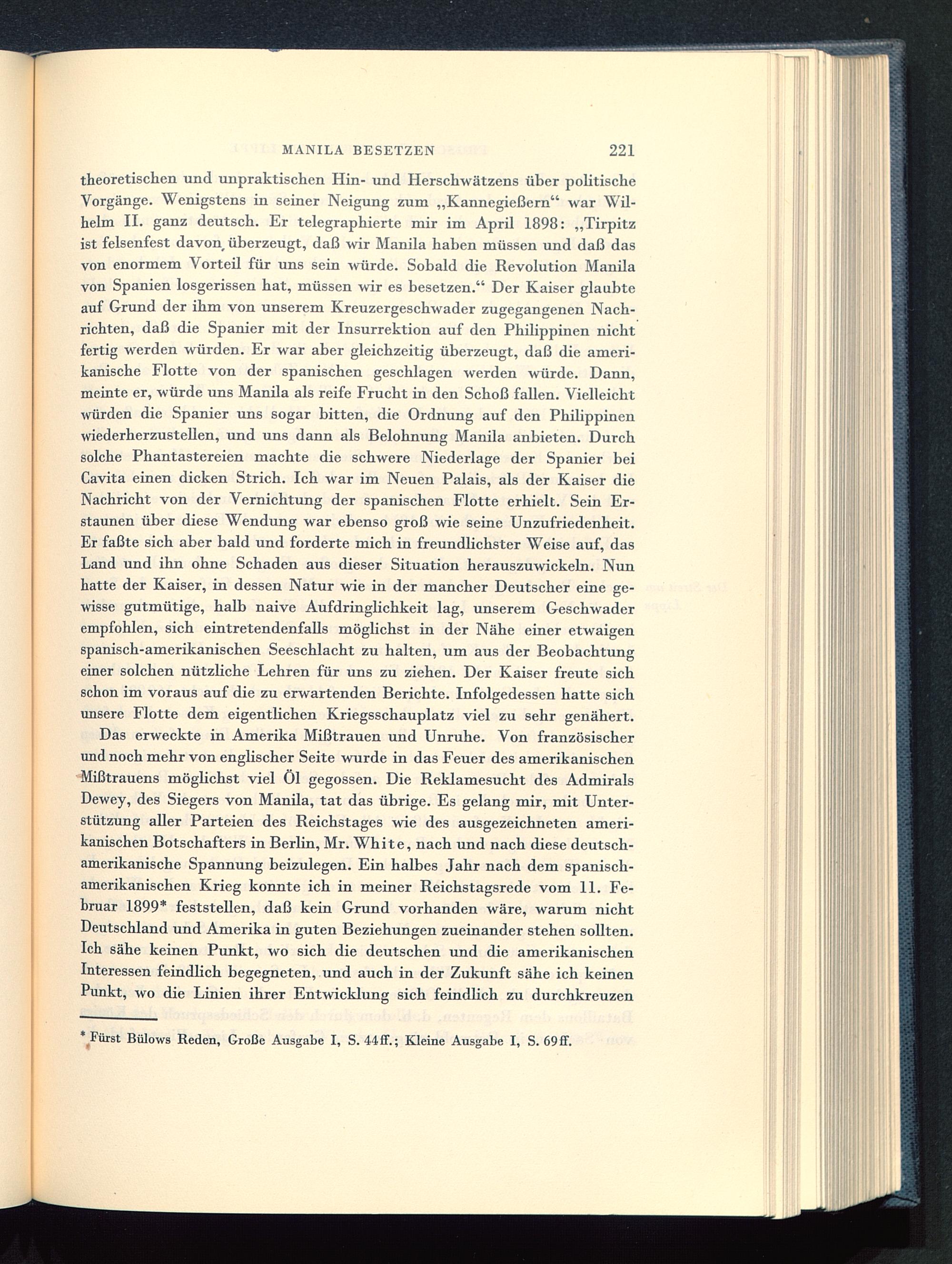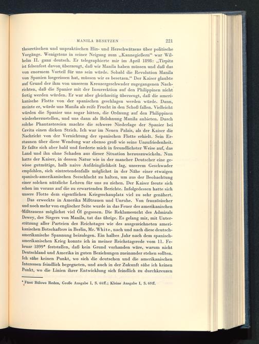 theoretischen und unpraktischen Hin- und Herschwätzens über politischeVorgänge. Wenigstens in seiner Neigung zum „Kannegießern" war Wil-helm II. ganz deutsch. Er telegraphierte mir im April 1898: „Tirpitzist felsenfest davon überzeugt, daß wir Manila haben müssen und daß dasvon enormem Vorteil für uns sein würde. Sobald die Revolution Manüavon Spanien losgerissen hat, müssen wir es besetzen." Der Kaiser glaubteauf Grund der ihm von unserem Kreuzergeschwader zugegangenen Nach-richten, daß die Spanier mit der Insurrektion auf den Philippinen nichtfertig werden würden. Er war aber gleichzeitig überzeugt, daß die ameri-kanische Flotte von der spanischen geschlagen werden würde. Dann,meinte er, würde uns Manila als reife Frucht in den Schoß fallen. Vielleichtwürden die Spanier uns sogar bitten, die Ordnung auf den Philippinenwiederherzustellen, und uns dann als Belohnung Manila anbieten. Durchsolche Phantastereien machte die schwere Niederlage der Spanier beiCavita einen dicken Strich. Ich war im Neuen Palais, als der Kaiser dieNachricht von der Vernichtung der spanischen Flotte erhielt. Sein Er-staunen über diese Wendung war ebenso groß wie seine Unzufriedenheit.Er faßte sich aber bald und forderte mich in freundlichster Weise auf, dasLand und ihn ohne Schaden aus dieser Situation herauszuwickeln. Nunhatte der Kaiser, in dessen Natur wie in der mancher Deutscher eine ge-wisse gutmütige, halb naive Aufdringlichkeit lag, unserem Geschwaderempfohlen, sich eintretendenfalls möglichst in der Nähe einer etwaigenspanisch-amerikanischen Seeschlacht zu halten, um aus der Beobachtungeiner solchen nützliche Lehren für uns zu ziehen. Der Kaiser freute sichschon im voraus auf die zu erwartenden Berichte. Infolgedessen hatte sichunsere Flotte dem eigentlichen Kriegsschauplatz viel zu sehr genähert.