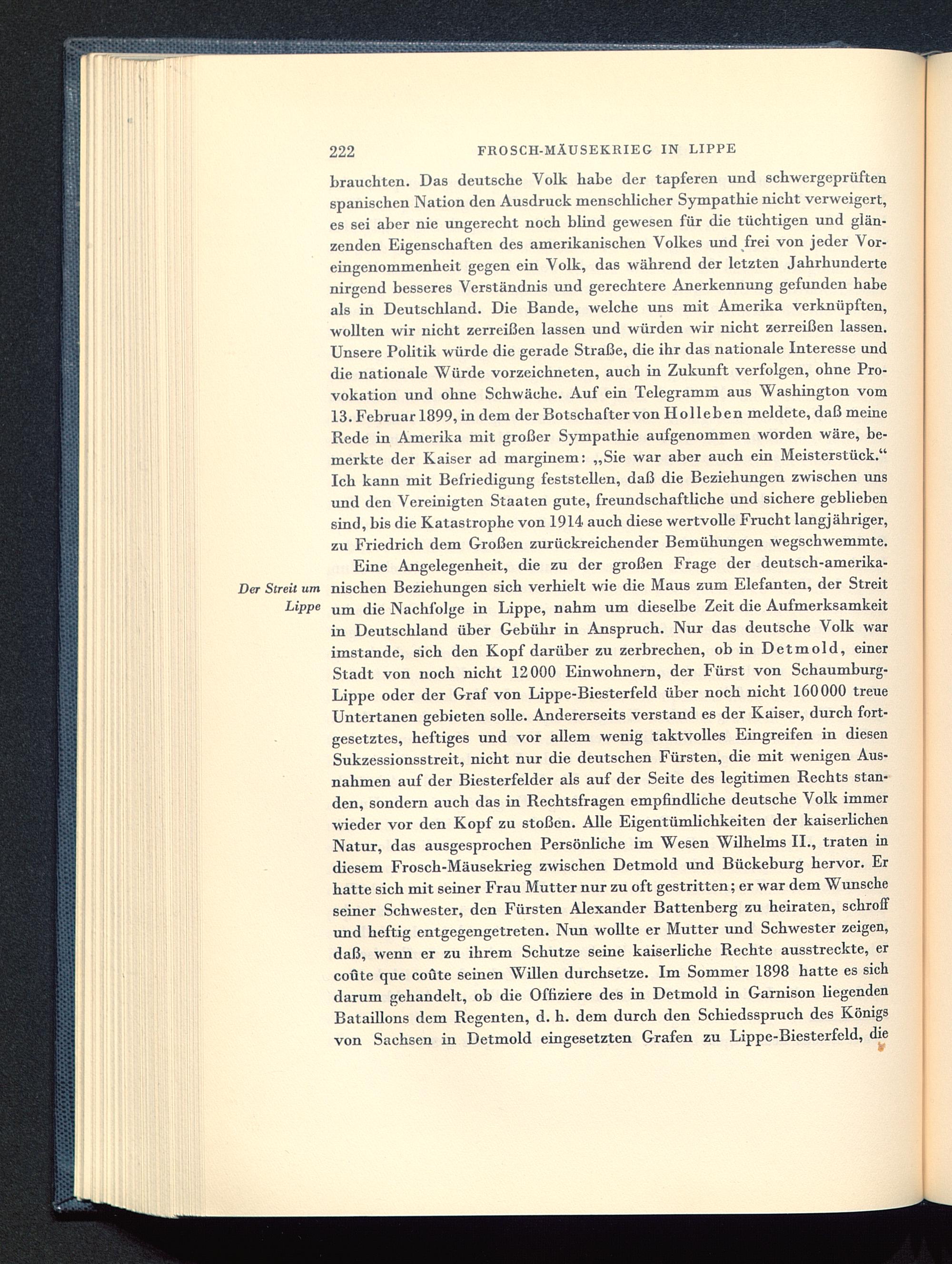 brauchten. Das deutsche Volk habe der tapferen und schwergeprüftenspanischen Nation den Ausdruck menschlicher Sympathie nicht verweigert,es sei aber nie ungerecht noch blind gewesen für die tüchtigen und glän-zenden Eigenschaften des amerikanischen Volkes und frei von jeder Vor-eingenommenheit gegen ein Volk, das während der letzten Jahrhundertenirgend besseres Verständnis und gerechtere Anerkennung gefunden habeals in Deutschland. Die Bande, welche uns mit Amerika verknüpften,wollten wir nicht zerreißen lassen und würden wir nicht zerreißen lassen.Unsere Politik würde die gerade Straße, die ihr das nationale Interesse unddie nationale Würde vorzeichneten, auch in Zukunft verfolgen, ohne Pro-vokation und ohne Schwäche. Auf ein Telegramm aus Washington vom13. Februar 1899, in dem der Botschafter von Holleben meldete, daß meineRede in Amerika mit großer Sympathie aufgenommen worden wäre, be-merkte der Kaiser ad marginem: „Sie war aber auch ein Meisterstück."Ich kann mit Befriedigung feststellen, daß die Beziehungen zwischen unsund den Vereinigten Staaten gute, freundschaftliche und sichere gebliebensind, bis die Katastrophe von 1914 auch diese wertvolle Frucht langjähriger,zu Friedrich dem Großen zurückreichender Bemühungen wegschwemmte.Eine Angelegenheit, die zu der großen Frage der deutsch-amerika -Der Streit um nischen Beziehungen sich verhielt wie die Maus zum Elefanten, der StreitLippe um (jj e Nachfolge in Lippe, nahm um dieselbe Zeit die Aufmerksamkeitin Deutschland über Gebühr in Anspruch. Nur das deutsche Volk warimstande, sich den Kopf darüber zu zerbrechen, ob in Detmold, einerStadt von noch nicht 12000 Einwohnern, der Fürst von Schaumburg-Lippe oder der Graf von Lippe-Biesterfeld über noch nicht 160000 treueUntertanen gebieten solle. Andererseits verstand es der Kaiser, durch fort-gesetztes, heftiges und vor allem wenig taktvolles Eingreifen in diesenSukzessionsstreit, nicht nur die deutschen Fürsten, die mit wenigen Aus-nahmen auf der Biesterfelder als auf der Seite des legitimen Rechts stan-den, sondern auch das in Rechtsfragen empfindliche deutsche Volk immerwieder vor den Kopf zu stoßen. Alle Eigentümlichkeiten der kaiserlichenNatur, das ausgesprochen Persönliche im Wesen Wilhelms IL, traten indiesem Frosch-Mäusekrieg zwischen Detmold und Bückeburg hervor. Erhatte sich mit seiner Frau Mutter nur zu oft gestritten; er war dem Wunscheseiner Schwester, den Fürsten Alexander Battenberg zu heiraten, schroffund heftig entgegengetreten. Nun wollte er Mutter und Schwester zeigen,daß, wenn er zu ihrem Schutze seine kaiserliche Rechte ausstreckte, ercoüte que coüte seinen Willen durchsetze. Im Sommer 1898 hatte es sichdarum gehandelt, ob die Offiziere des in Detmold in Garnison hegendenBataillons dem Regenten, d. h. dem durch den Schiedsspruch des Königsvon Sachsen in Detmold eingesetzten Grafen zu Lippe-Biesterfeld, die