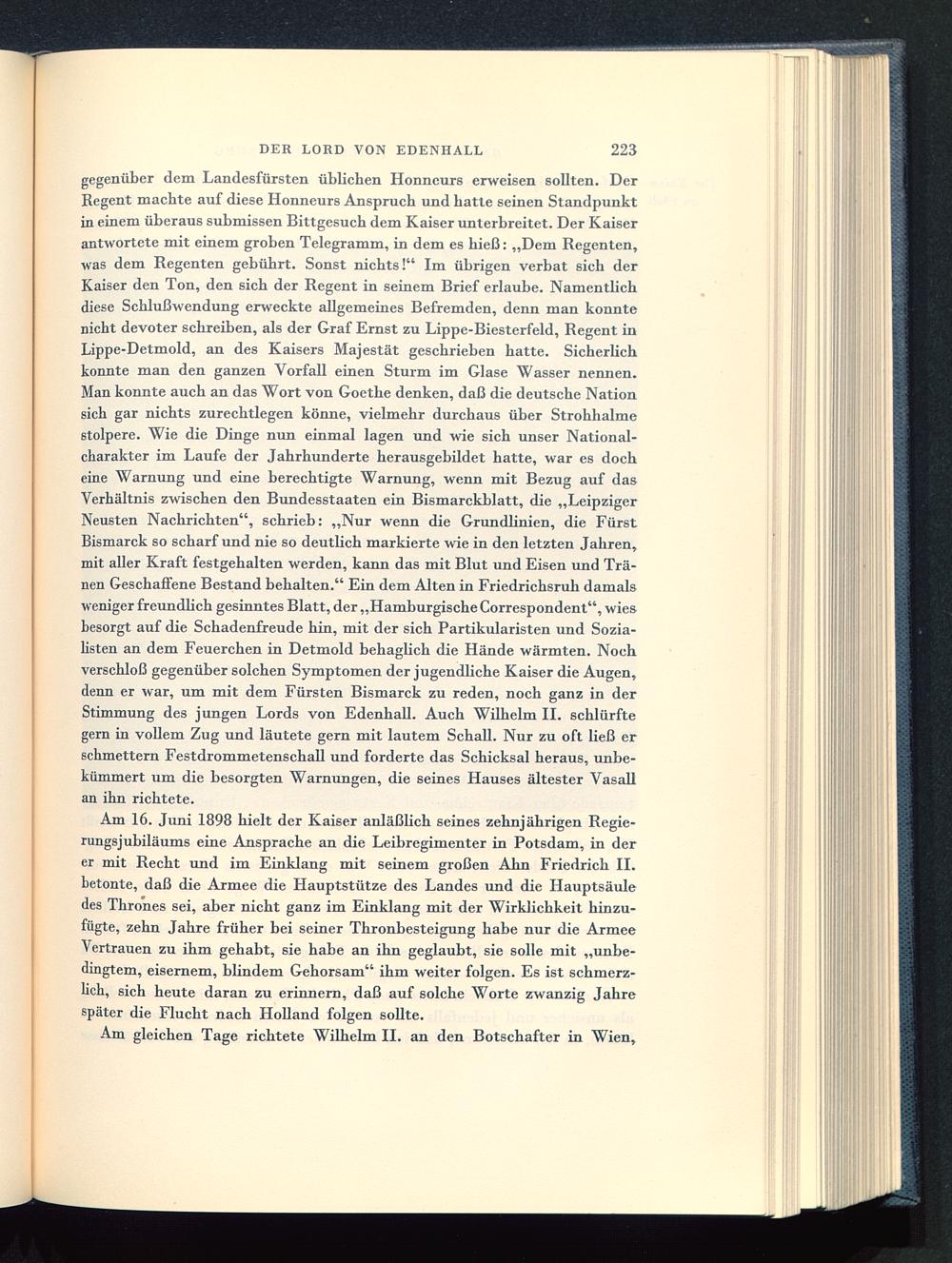 Am 16. Juni 1898 hielt der Kaiser anläßlich seines zehnjährigen Regie-rungsjubiläums eine Ansprache an die Leibregimenter in Potsdam , in derer mit Recht und im Einklang mit seinem großen Ahn Friedrich ILhetonte, daß die Armee die Hauptstütze des Landes und die Hauptsäuledes Thrones sei, aber nicht ganz im Einklang mit der Wirklichkeit hinzu-fügte, zehn Jahre früher bei seiner Thronbesteigung habe nur die ArmeeVertrauen zu ihm gehabt, sie habe an ihn geglaubt, sie solle mit „unbe-dingtem, eisernem, blindem Gehorsam" ihm weiter folgen. Es ist schmerz-lich, sich heute daran zu erinnern, daß auf solche Worte zwanzig Jahrespäter die Flucht nach Holland folgen sollte.
