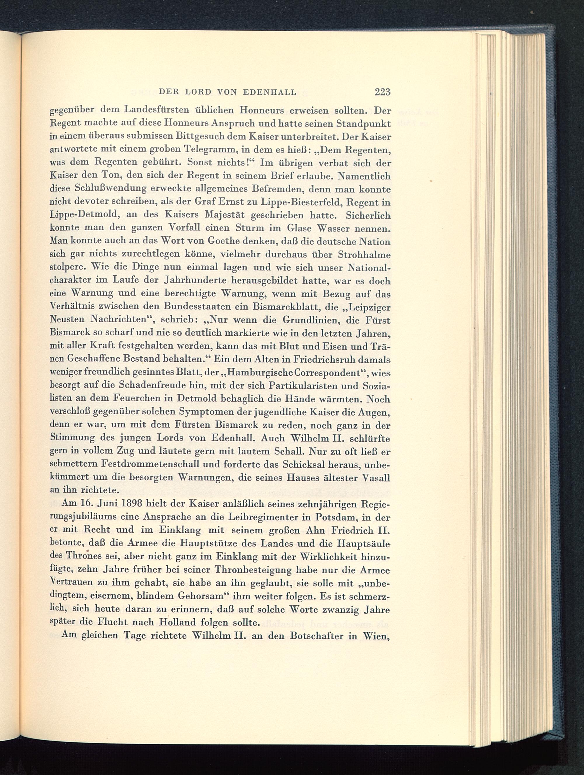 gegenüber dem Landesfürsten üblichen Honneurs erweisen sollten. DerRegent machte auf diese Honneurs Anspruch und hatte seinen Standpunktin einem überaus submissen Bittgesuch dem Kaiser unterbreitet. Der Kaiserantwortete mit einem groben Telegramm, in dem es hieß: „Dem Regenten,was dem Regenten gebührt. Sonst nichts!" Im übrigen verbat sich derKaiser den Ton, den sich der Regent in seinem Brief erlaube. Namentlichdiese Schlußwendung erweckte allgemeines Befremden, denn man konntenicht devoter schreiben, als der Graf Ernst zu Lippe-Biesterfeld, Regent inLippe-Detmold, an des Kaisers Majestät geschrieben hatte. Sicherlichkonnte man den ganzen Vorfall einen Sturm im Glase Wasser nennen.Man konnte auch an das Wort von Goethe denken, daß die deutsche Nationsich gar nichts zurechtlegen könne, vielmehr durchaus über Strohhalmestolpere. Wie die Dinge nun einmal lagen und wie sich unser National-charakter im Laufe der Jahrhunderte herausgebildet hatte, war es docheine Warnung und eine berechtigte Warnung, wenn mit Bezug auf dasVerhältnis zwischen den Bundesstaaten ein Bismarckblatt, die „LeipzigerNeusten Nachrichten", schrieb: „Nur wenn die Grundlinien, die FürstBismarck so scharf und nie so deutlich markierte wie in den letzten Jahren,mit aller Kraft festgehalten werden, kann das mit Blut und Eisen und Trä-nen Geschaffene Bestand behalten." Ein dem Alten in Friedrichsruh damalsweniger freundlich gesinntes Blatt, der „Hamburgische Correspondent", wiesbesorgt auf die Schadenfreude hin, mit der sich Partikularisten und Sozia-listen an dem Feuerchen in Detmold behaglich die Hände wärmten. Nochverschloß gegenüber solchen Symptomen der jugendliche Kaiser die Augen,denn er war, um mit dem Fürsten Bismarck zu reden, noch ganz in derStimmung des jungen Lords von Edenhall. Auch Wilhelm II. schlürftegern in vollem Zug und läutete gern mit lautem Schall. Nur zu oft ließ erschmettern Festdrommetenschall und forderte das Schicksal heraus, unbe-kümmert um die besorgten Warnungen, die seines Hauses ältester Vasallan ihn richtete.
